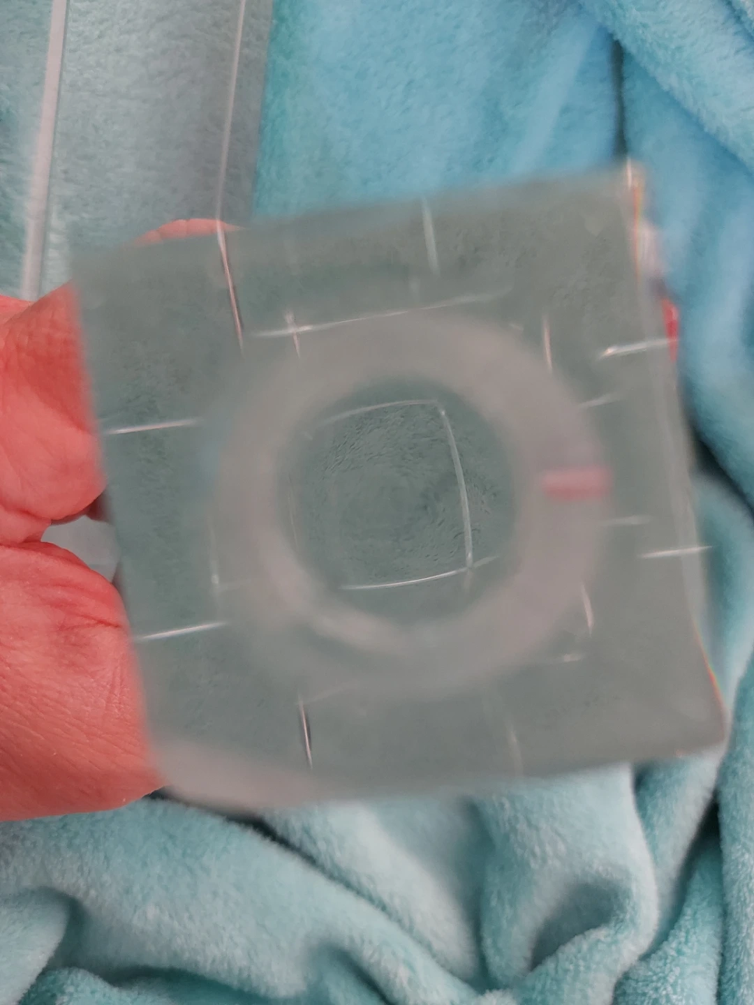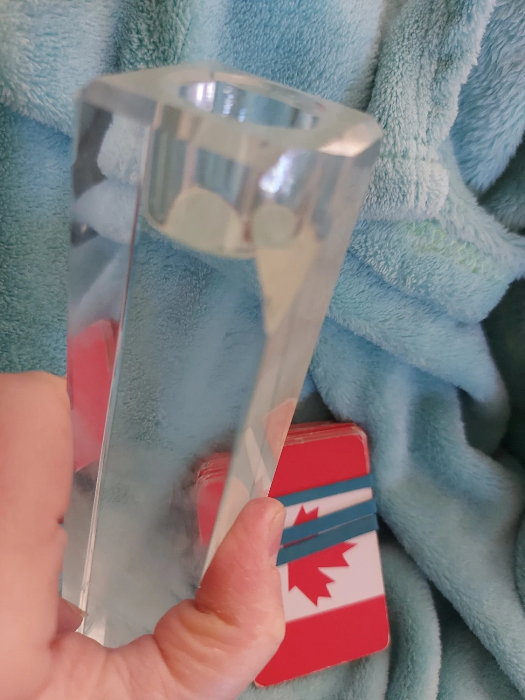 Two clear glass candlestick holders. Perfect for adding a touch of elegance to any table setting. These holders are made of heavy glass and are designed to hold taper candles securely. They're a great addition to your home decor! One has a small crack on the top in the photo. Cards for size.