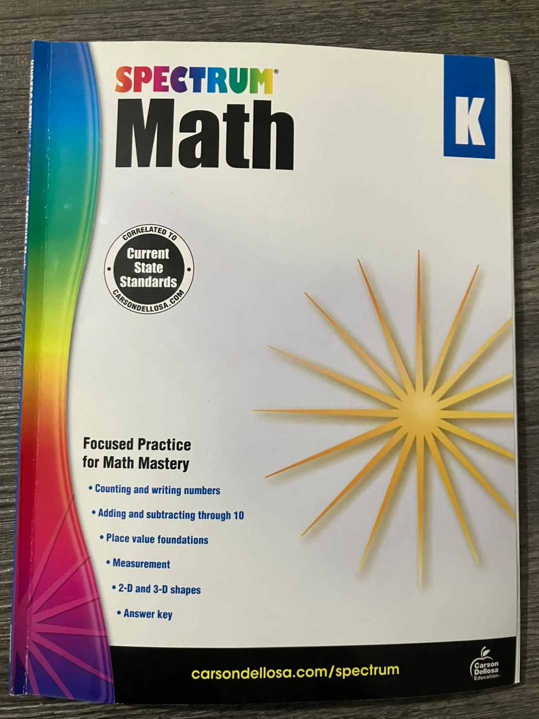 Selling a Spectrum Math workbook for Kindergarten. It's great for focused practice and math mastery! It covers counting and writing numbers, adding and subtracting through 10, place value foundations, measurement, and 2-D and 3-D shapes. Includes an answer key for easy checking