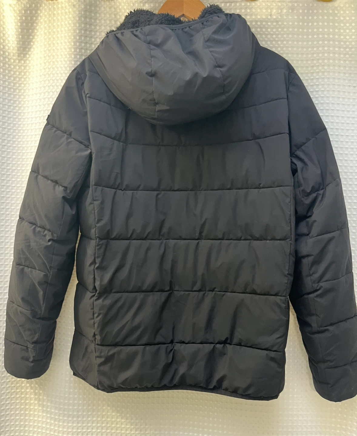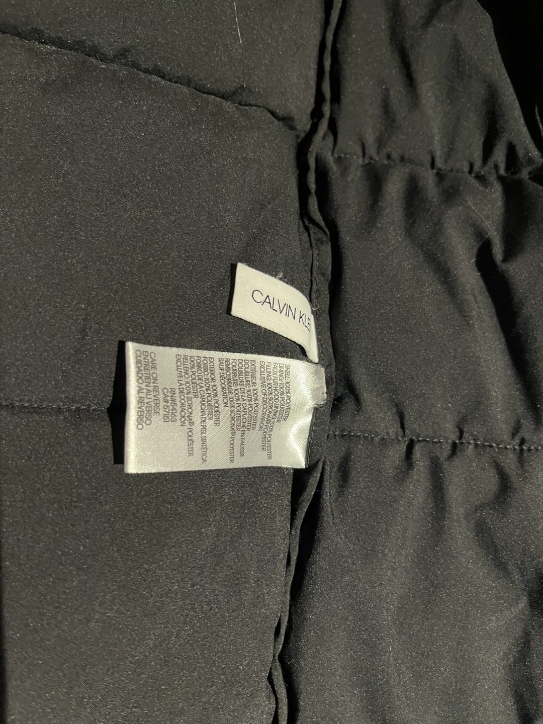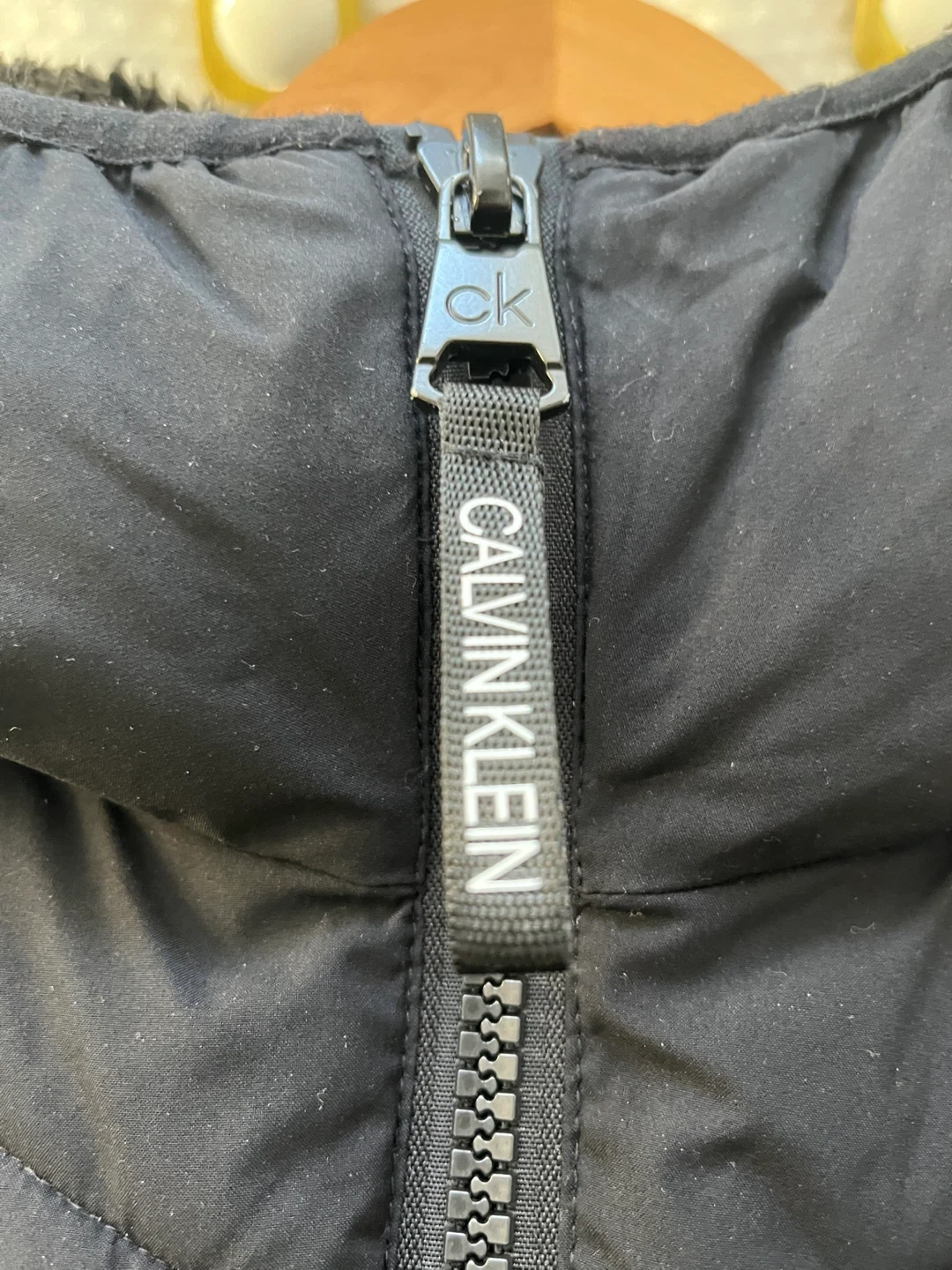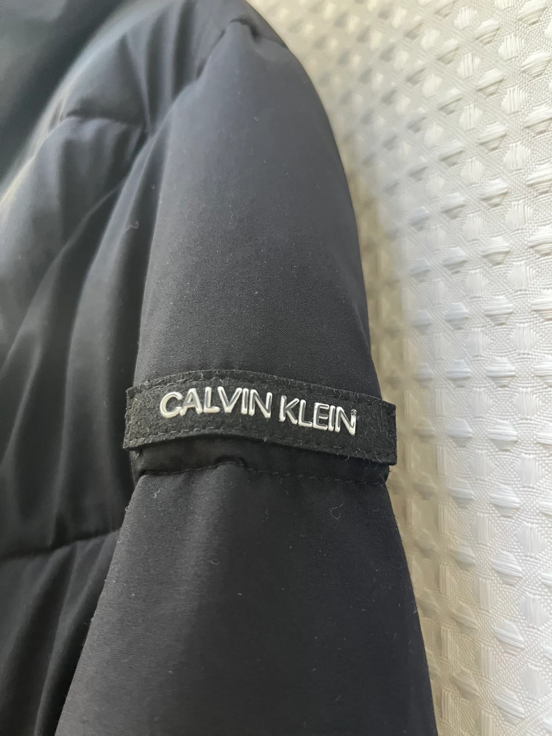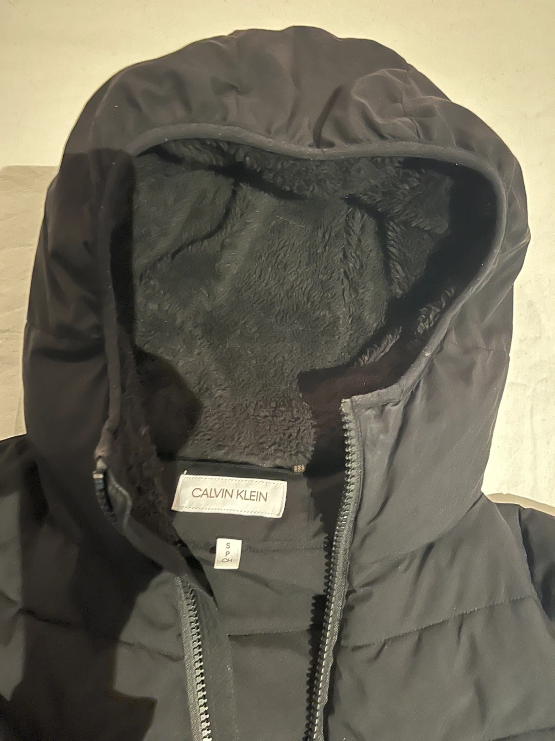 Black Calvin Klein puffer jacket. Size is S but can fit M too. Made with Sorona Aura, offering a smoother feel and exceptional softness. Breathable insulation for warmth. Has a soft, cozy hood!