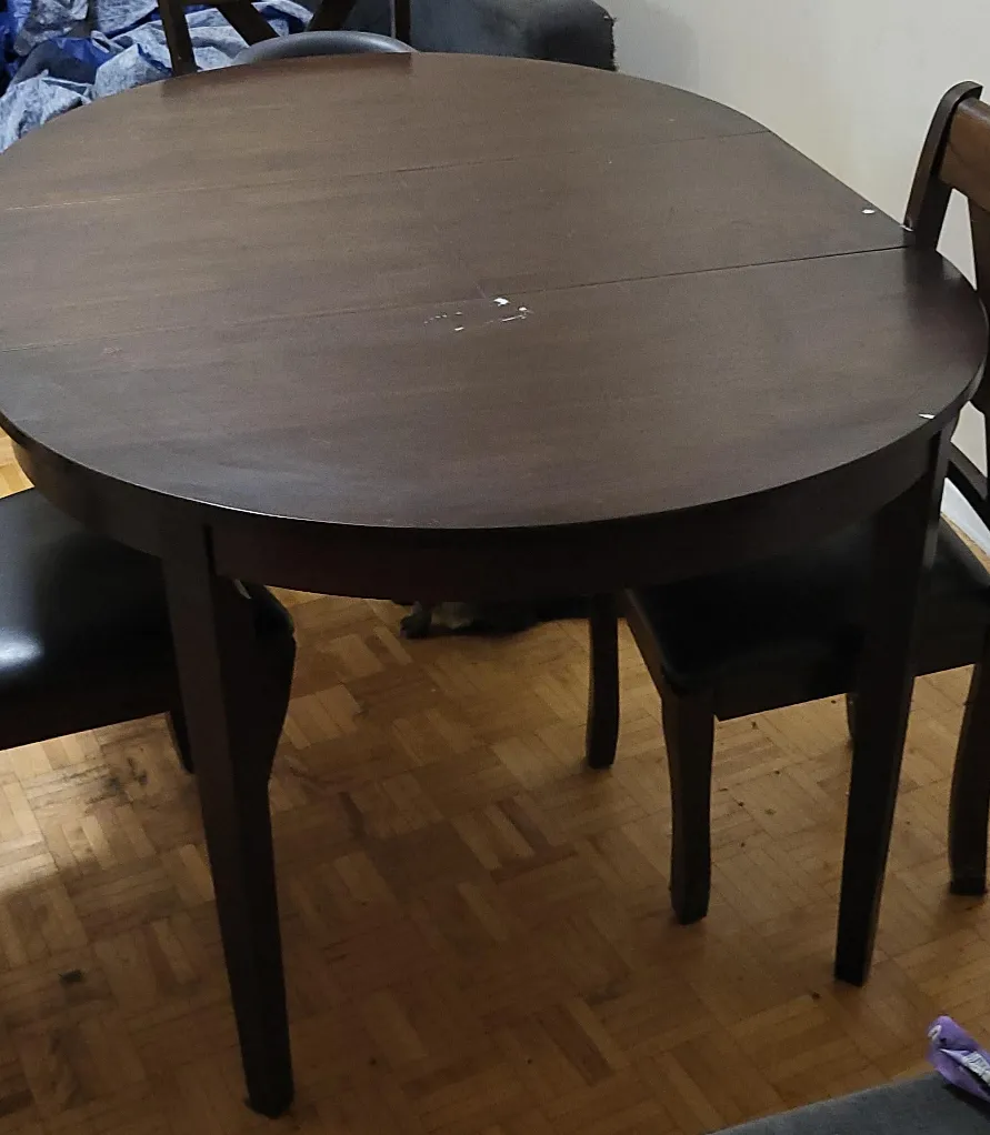 This is a dark brown dining table with an oval shape. It's made of wood and has a classic design. This table would be useful for small gatherings or everyday meals.