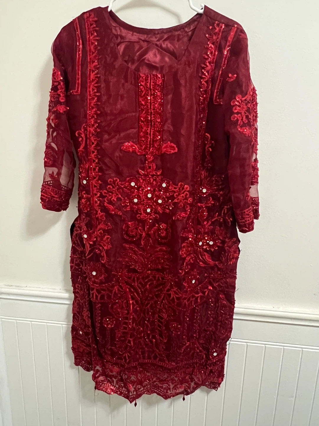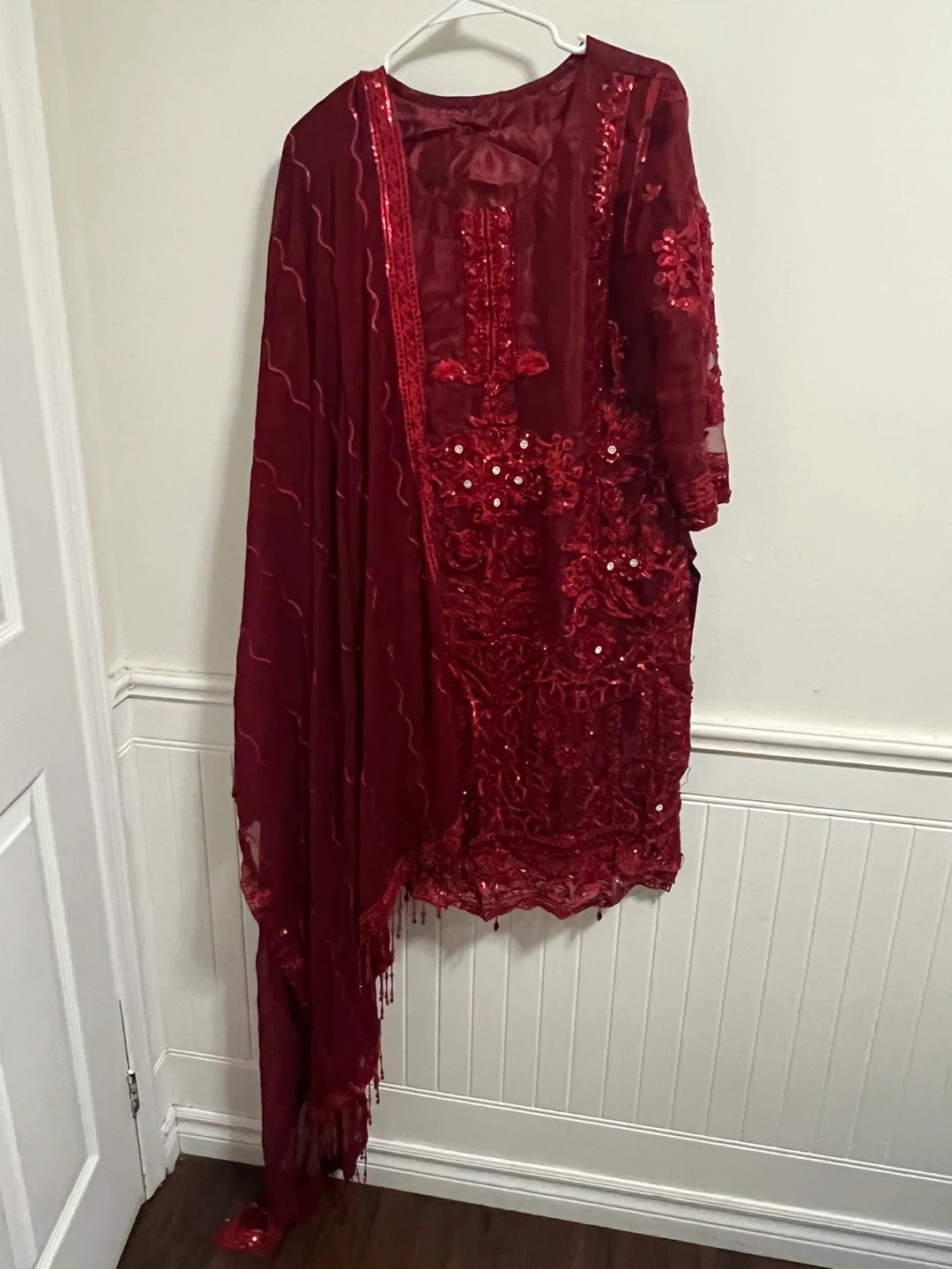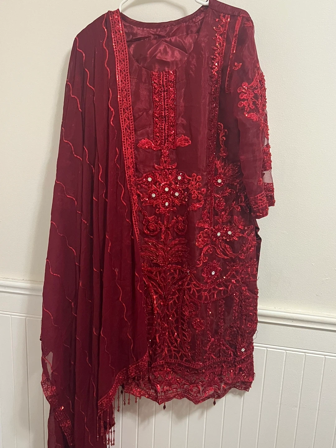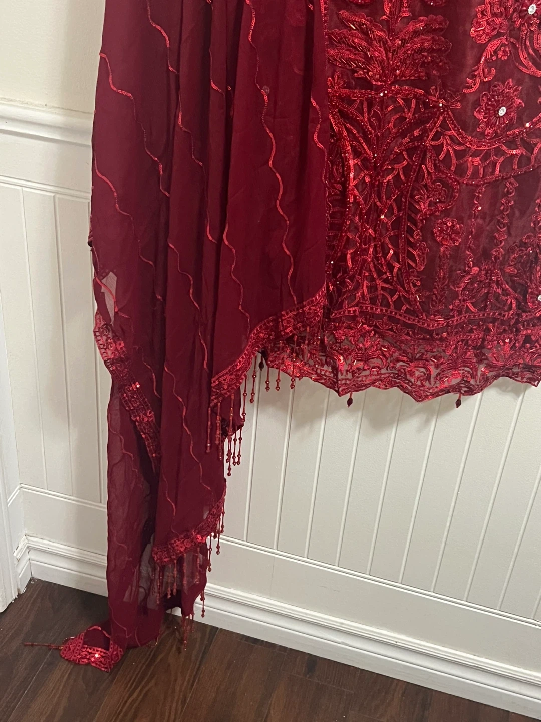 Beautiful red salwar kameez with intricate embroidery. The fabric is a lovely shade of red, adorned with delicate beadwork and embroidery. Perfect for a special occasion!