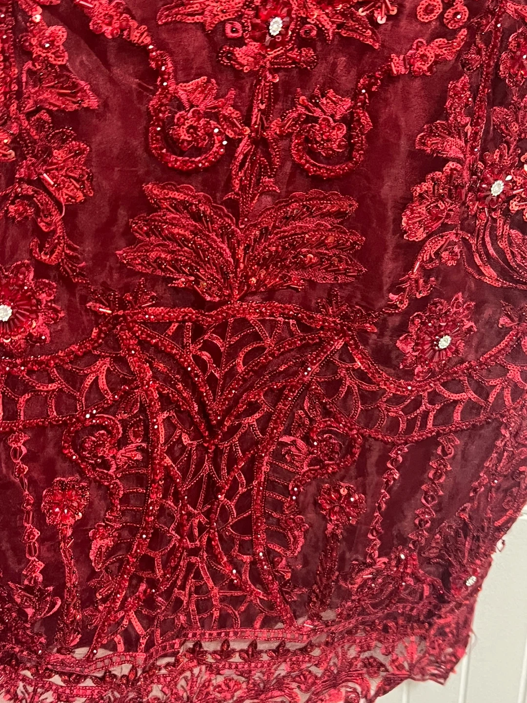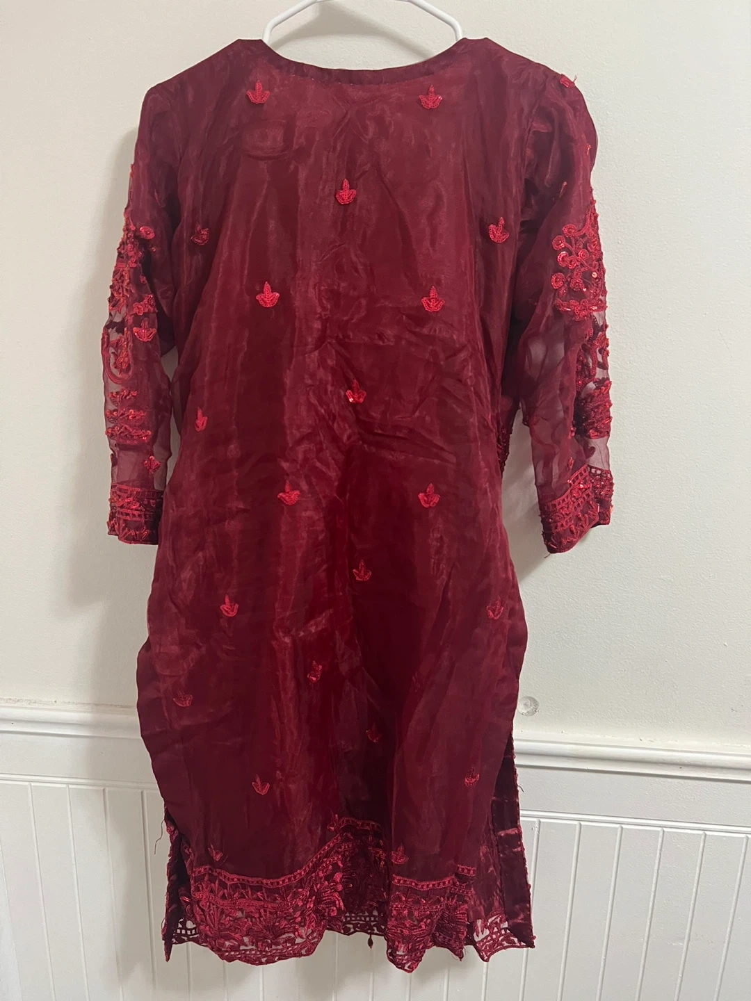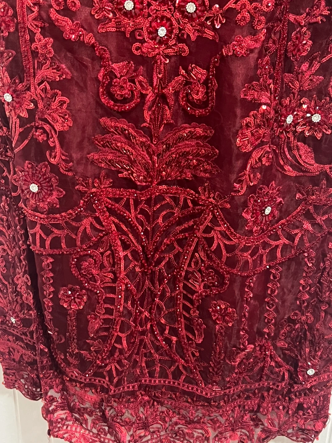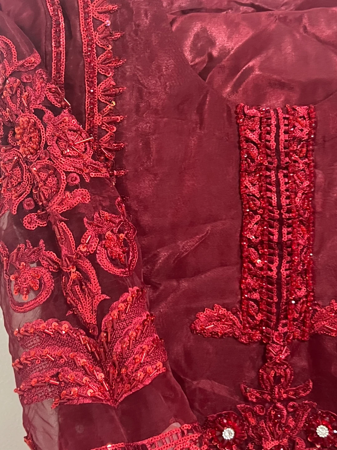 Beautiful red salwar kameez with intricate embroidery. The fabric is a lovely shade of red, adorned with delicate beadwork and embroidery. Perfect for a special occasion!