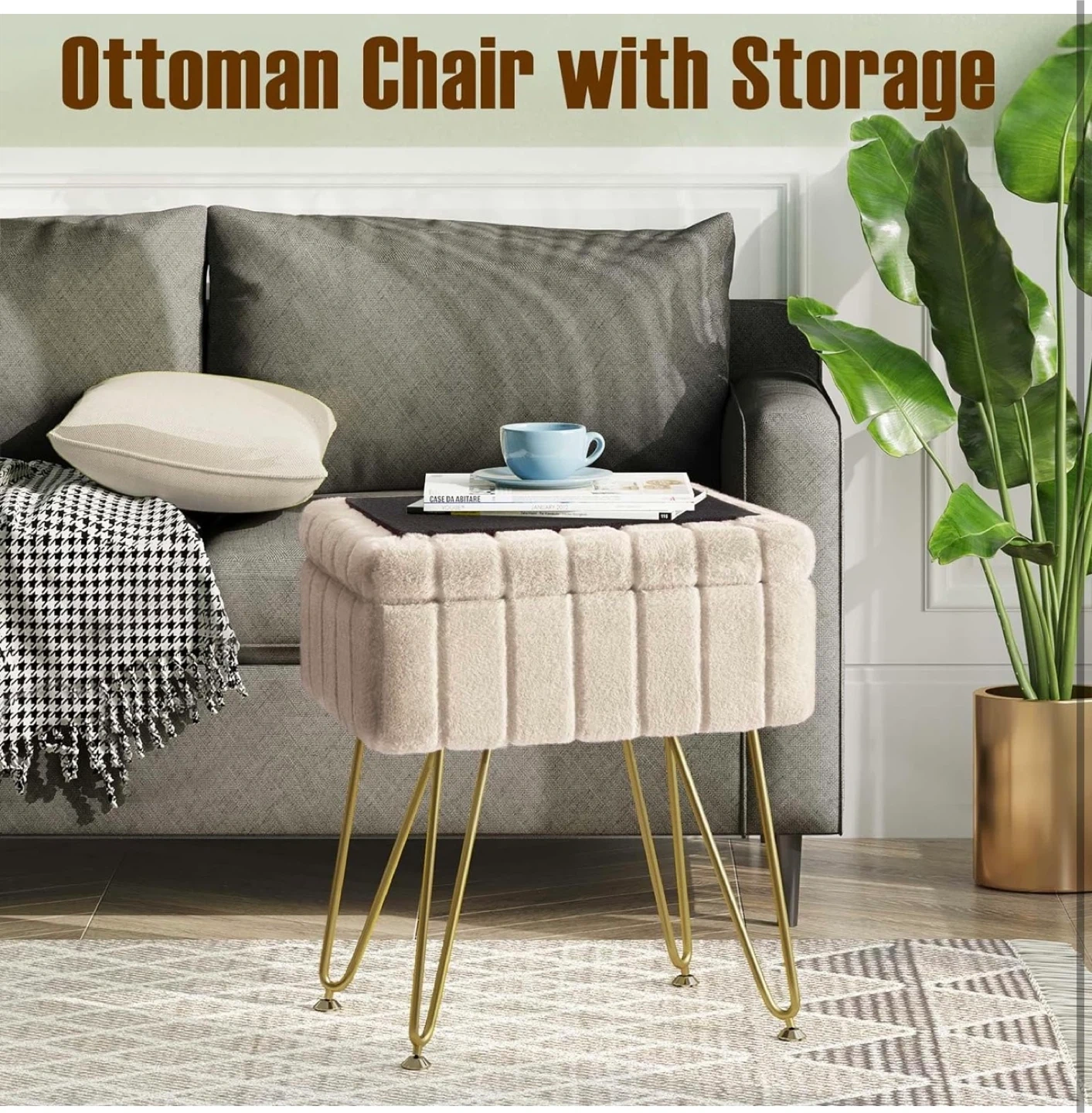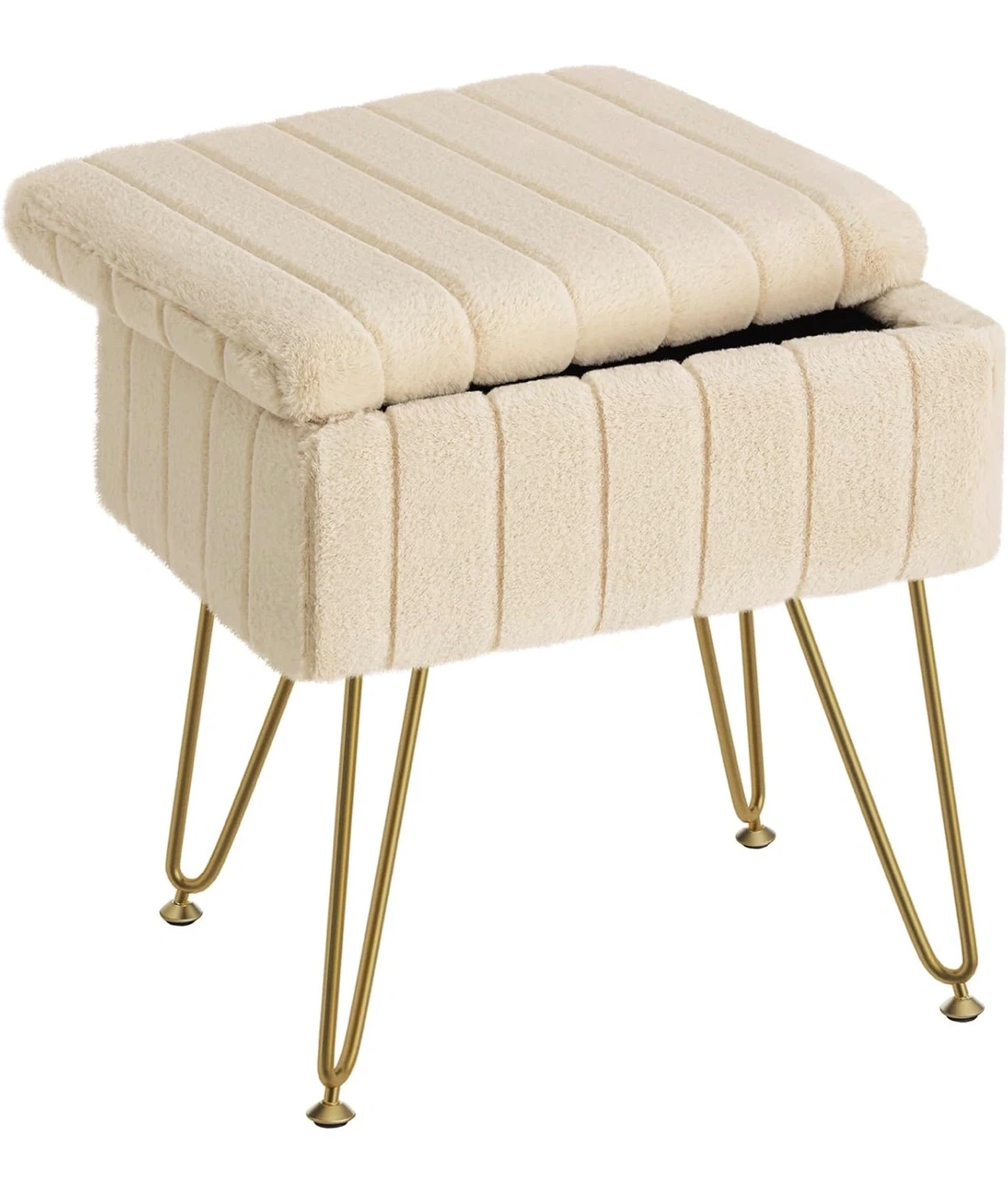 This ottoman chair is perfect for adding extra seating and storage to any room! It features a soft, beige cushioned top with a lift-up lid that reveals a spacious storage compartment inside. The gold-tone metal legs add a touch of elegance. The dimensions are approximately 15.7in x 11.8in x 19.4in, with a capacity of 8L and a max load of 284lb