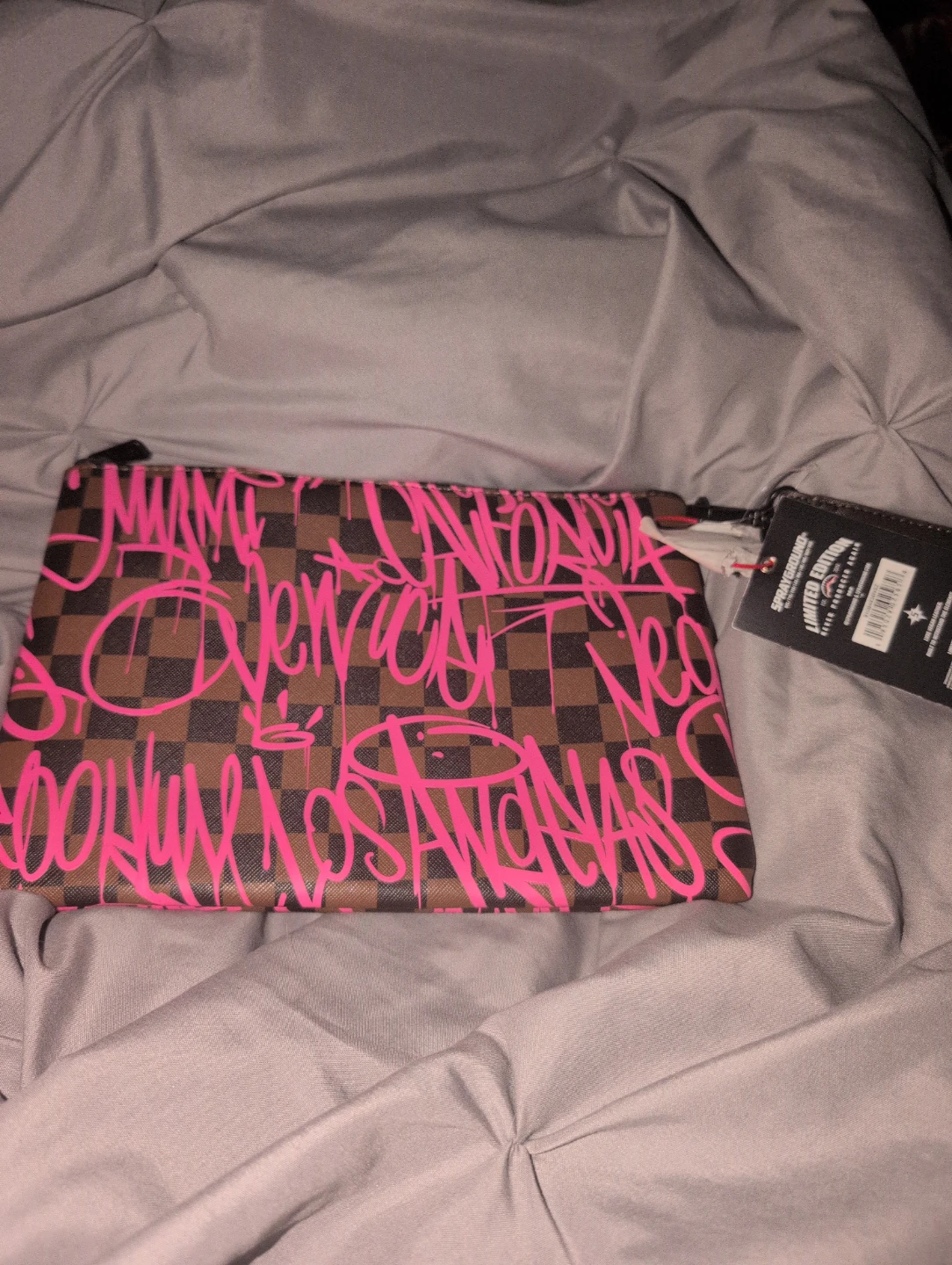 This is a Sprayground pouch with a unique graffiti-style design in pink and brown. It's perfect for carrying your essentials in style. The pouch has a zipper closure to keep your items secure. It also has a wrist strap for easy carrying. The tag is still attached!