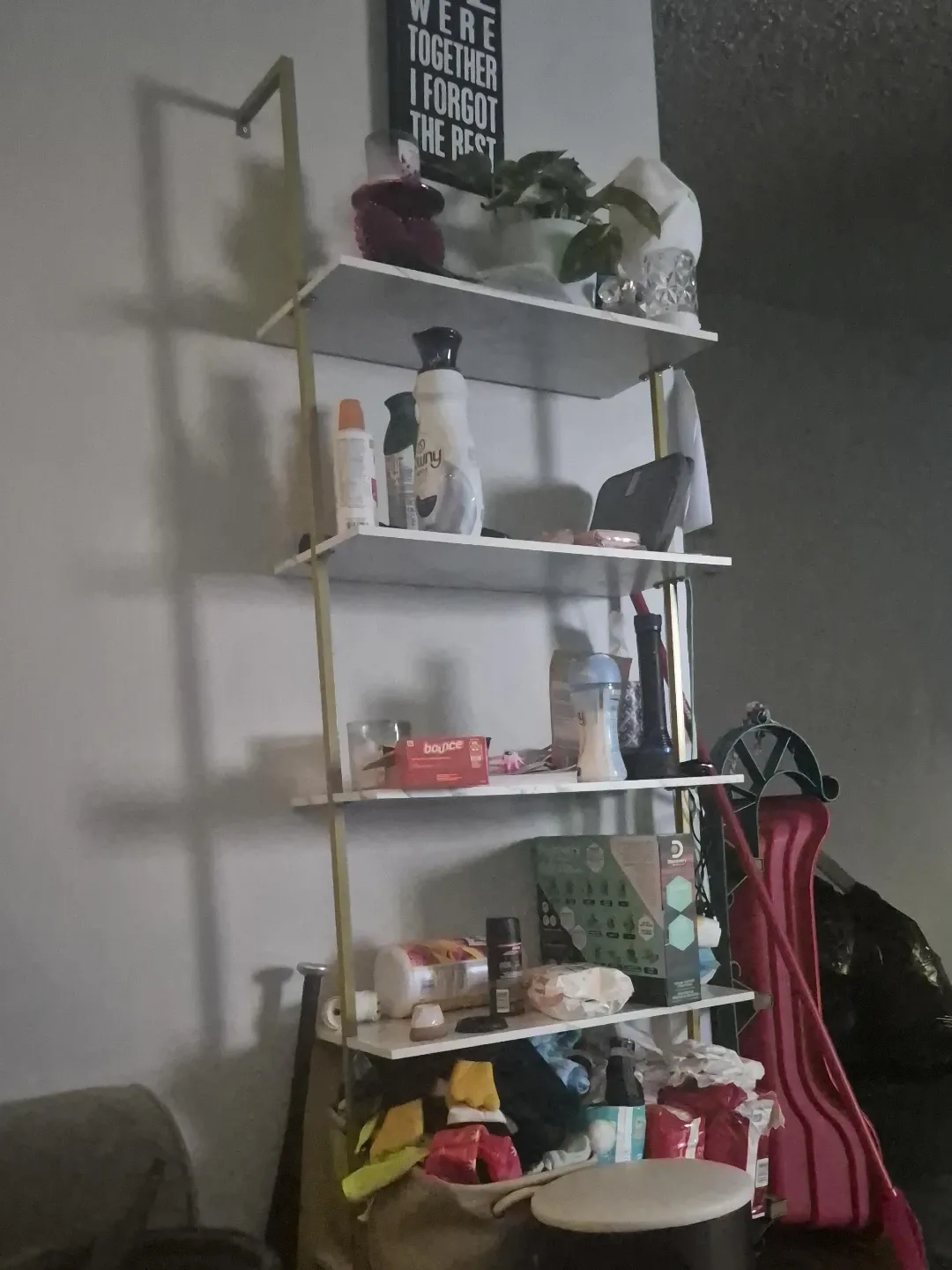 This is a multi-use storage unit with a gold frame and marble-look shelves. It's great for organizing items in any room. Dimensions are approximately 5 feet tall and 1.5 feet wide.