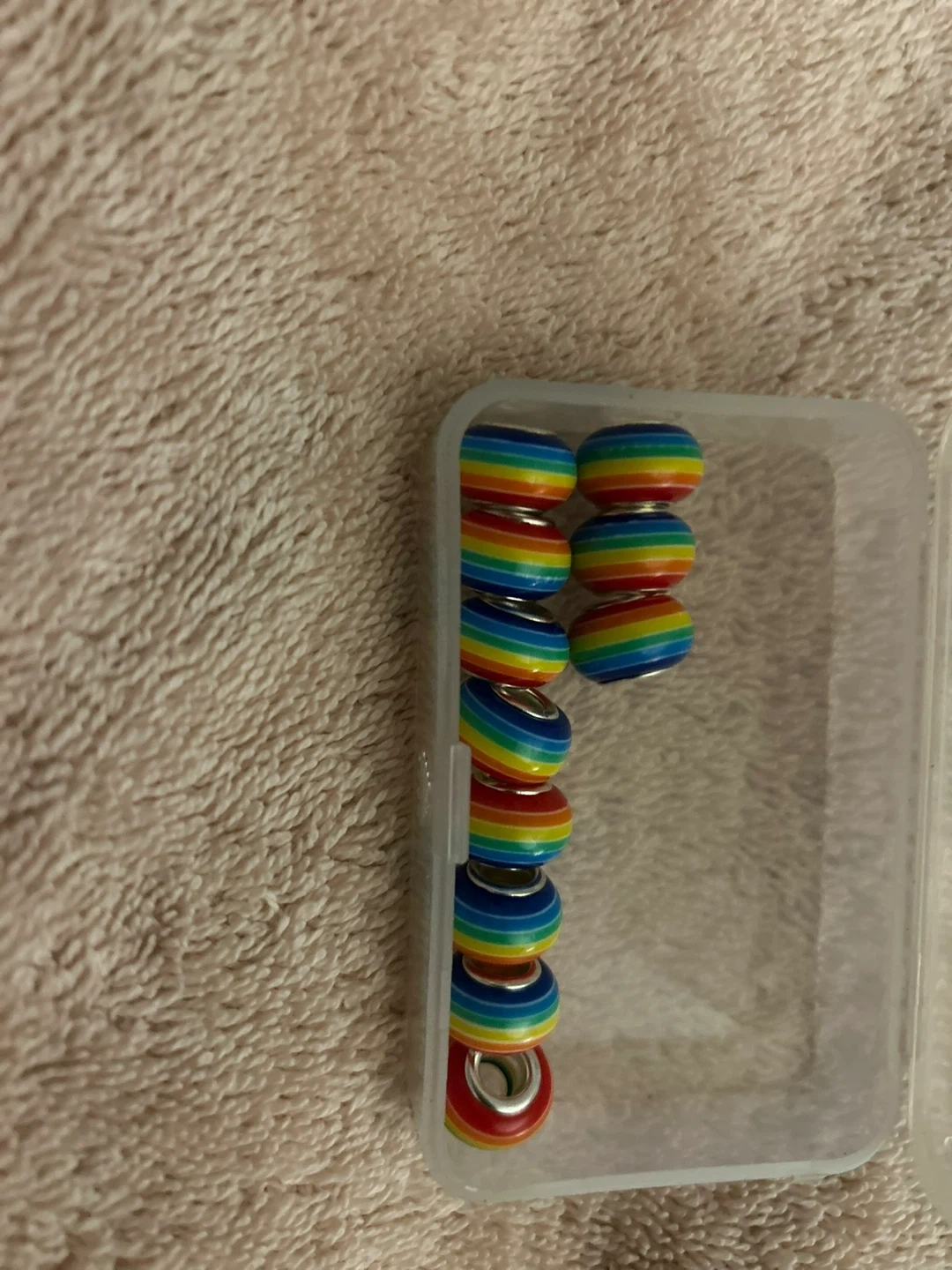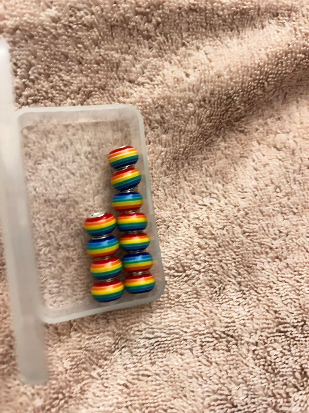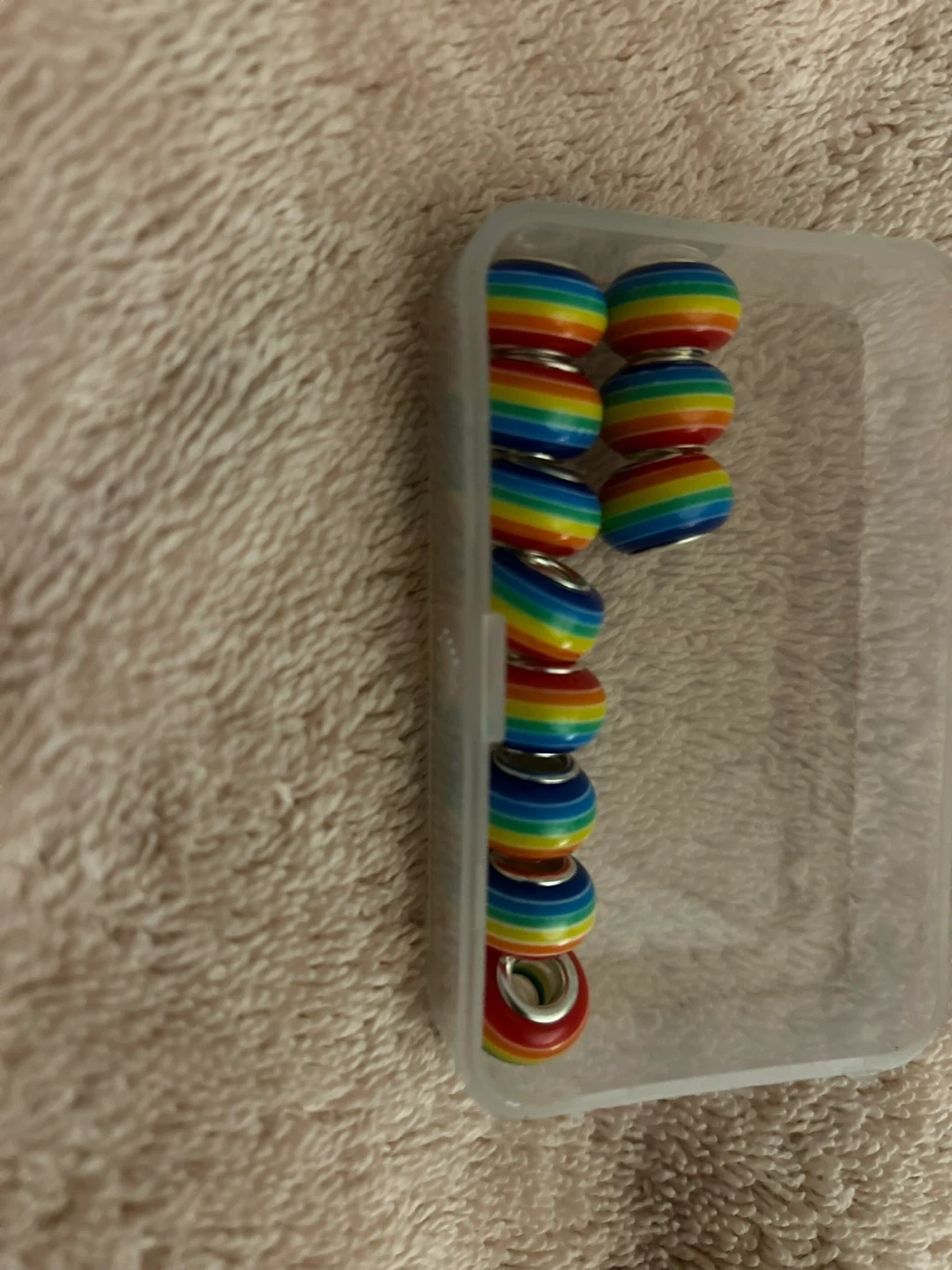 Set of 10 colourful rainbow spacer beads for jewellery making. They feature a rainbow striped design with a silver-tone core. These beads are perfect for adding a pop of colour to bracelets or necklaces.