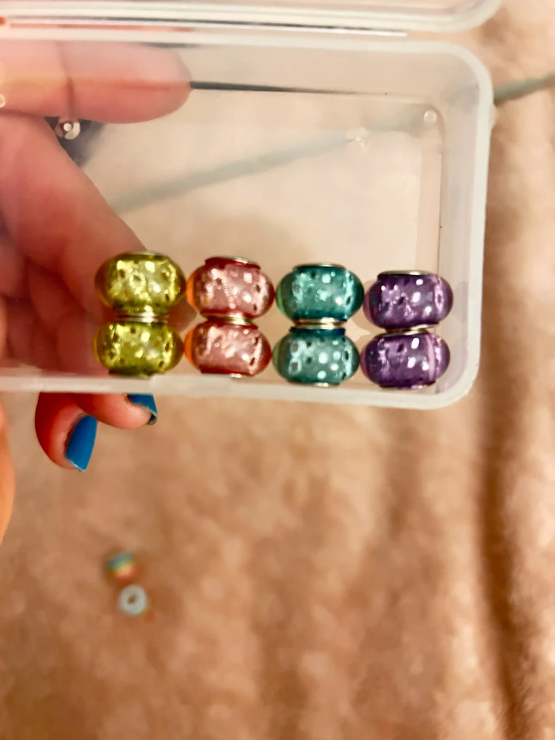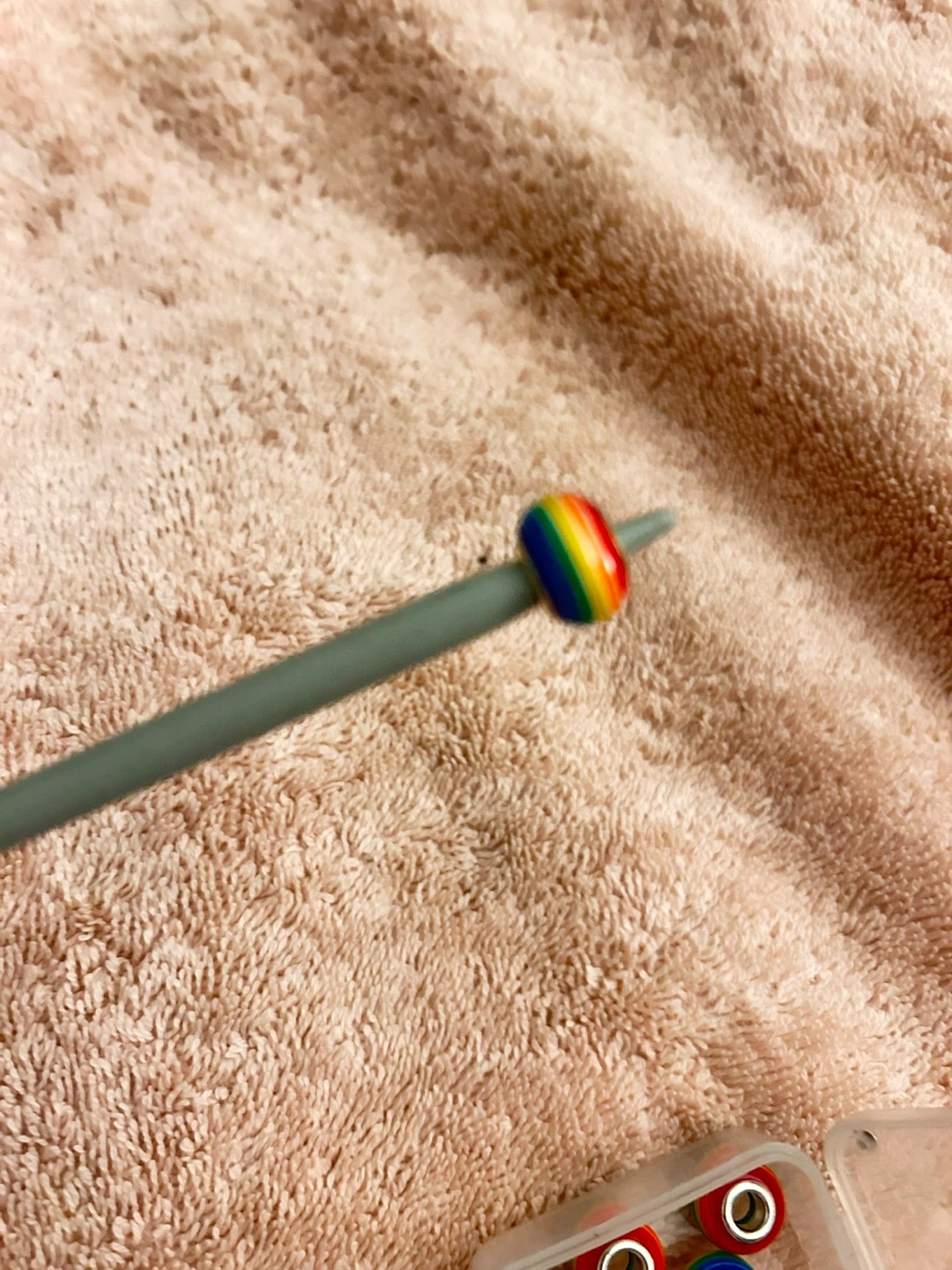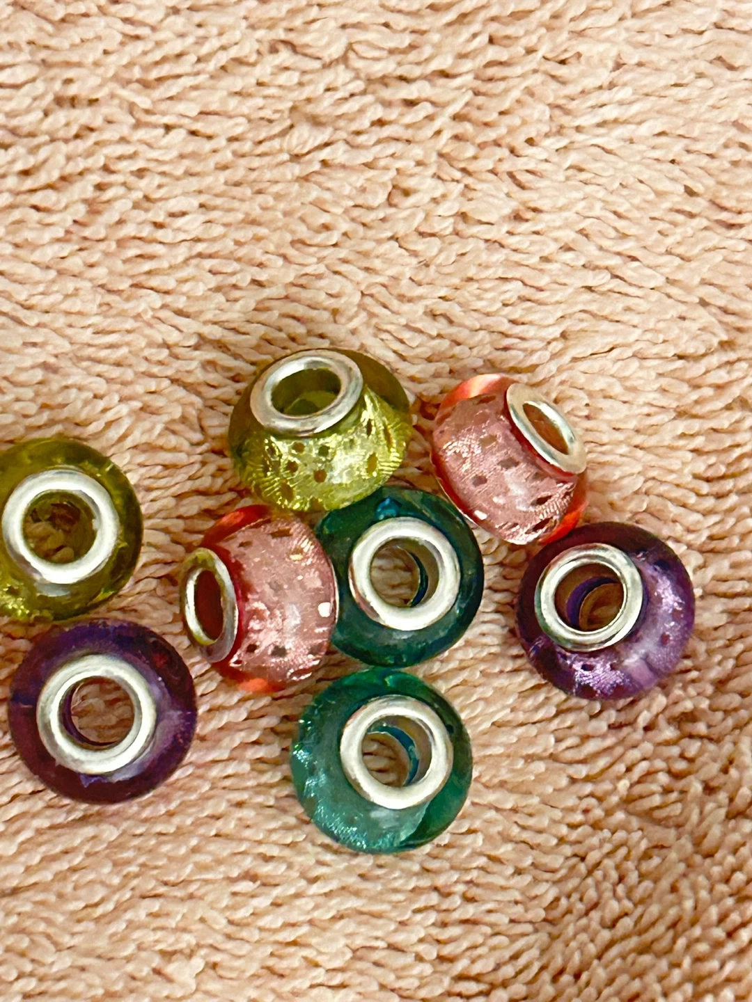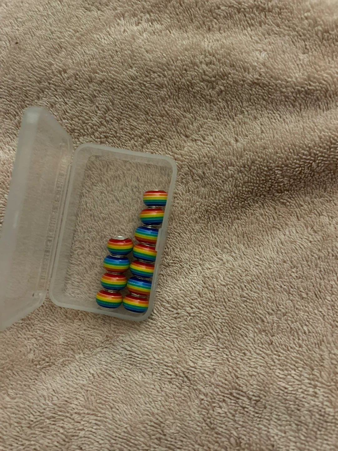 Set of 10 colourful rainbow spacer beads for jewellery making. They feature a rainbow striped design with a silver-tone core. These beads are perfect for adding a pop of colour to bracelets or necklaces.