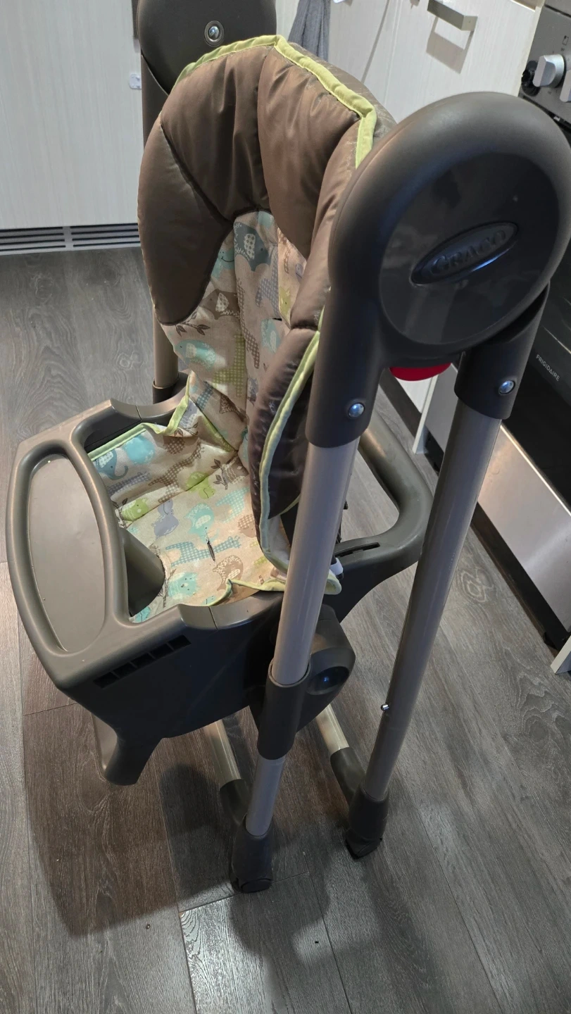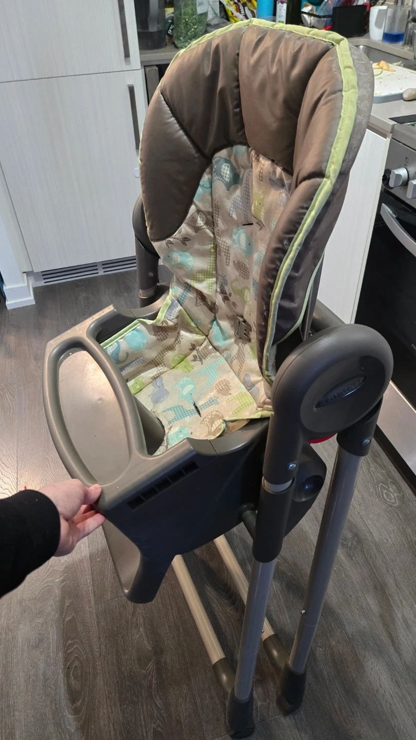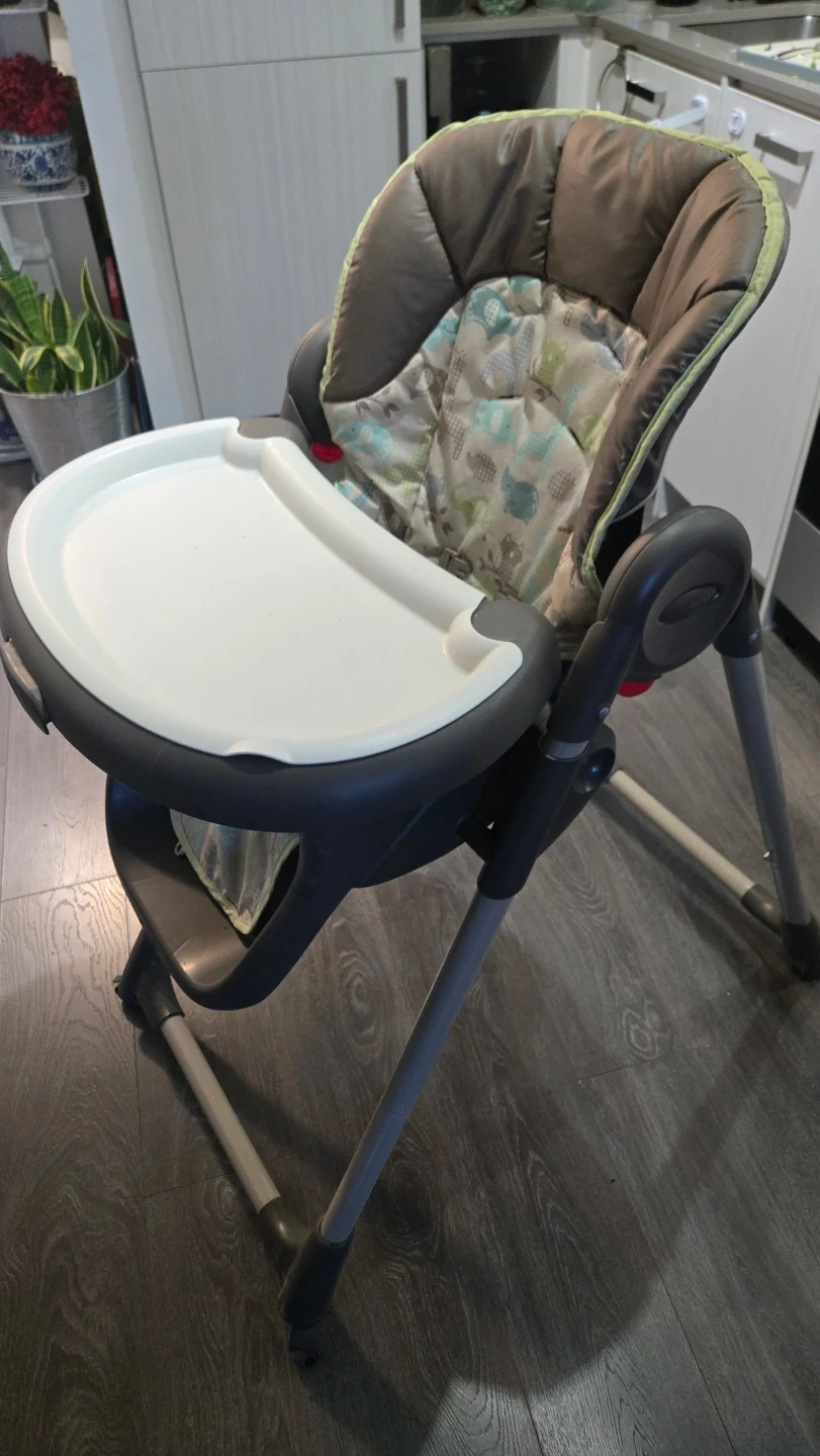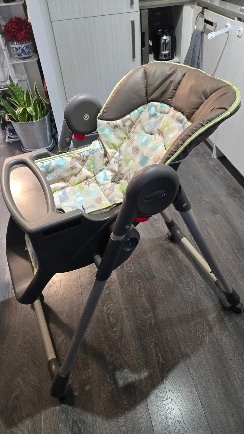 This is a Graco high chair with a padded seat and a removable tray. It features a foldable design for easy storage. Great for feeding little ones during meal times! Pickup at Yonge-Eglinton area. Cash only.