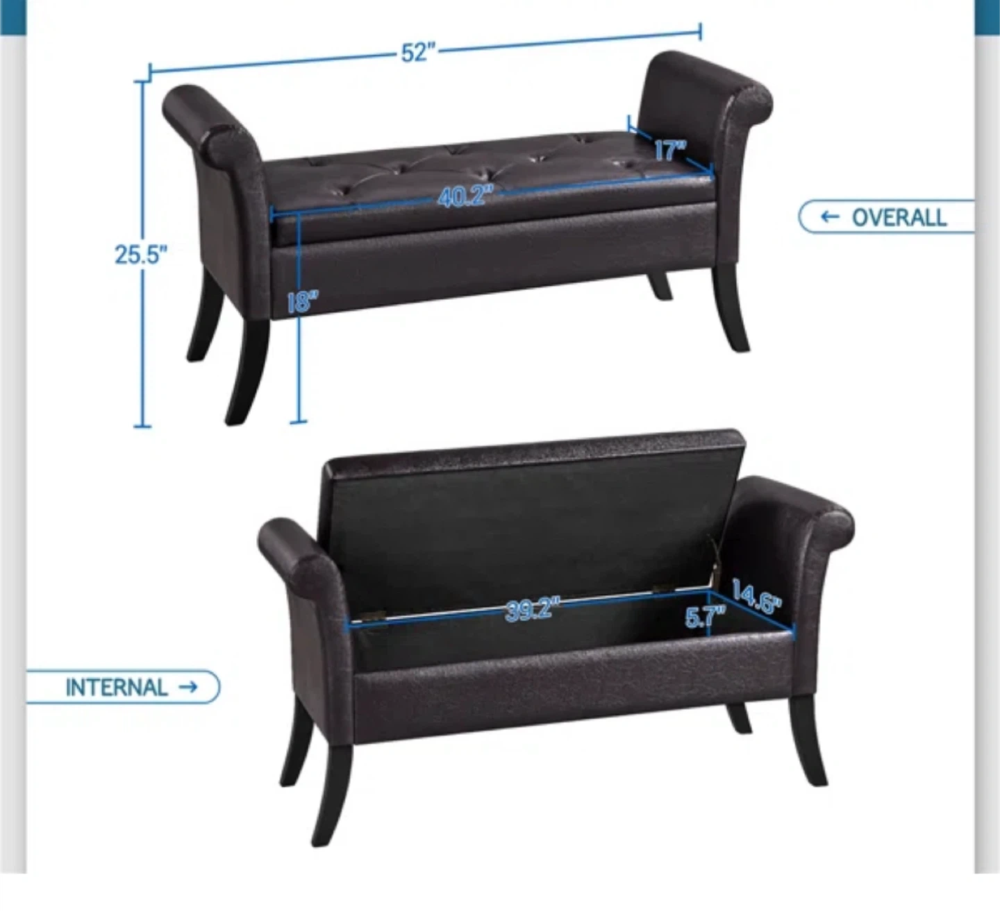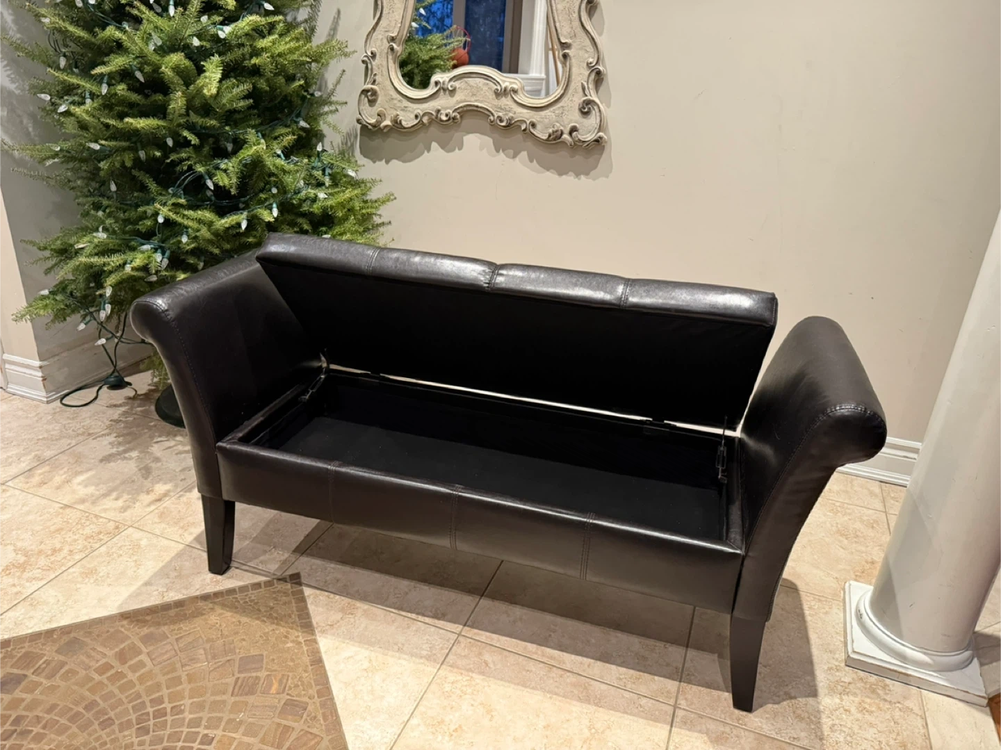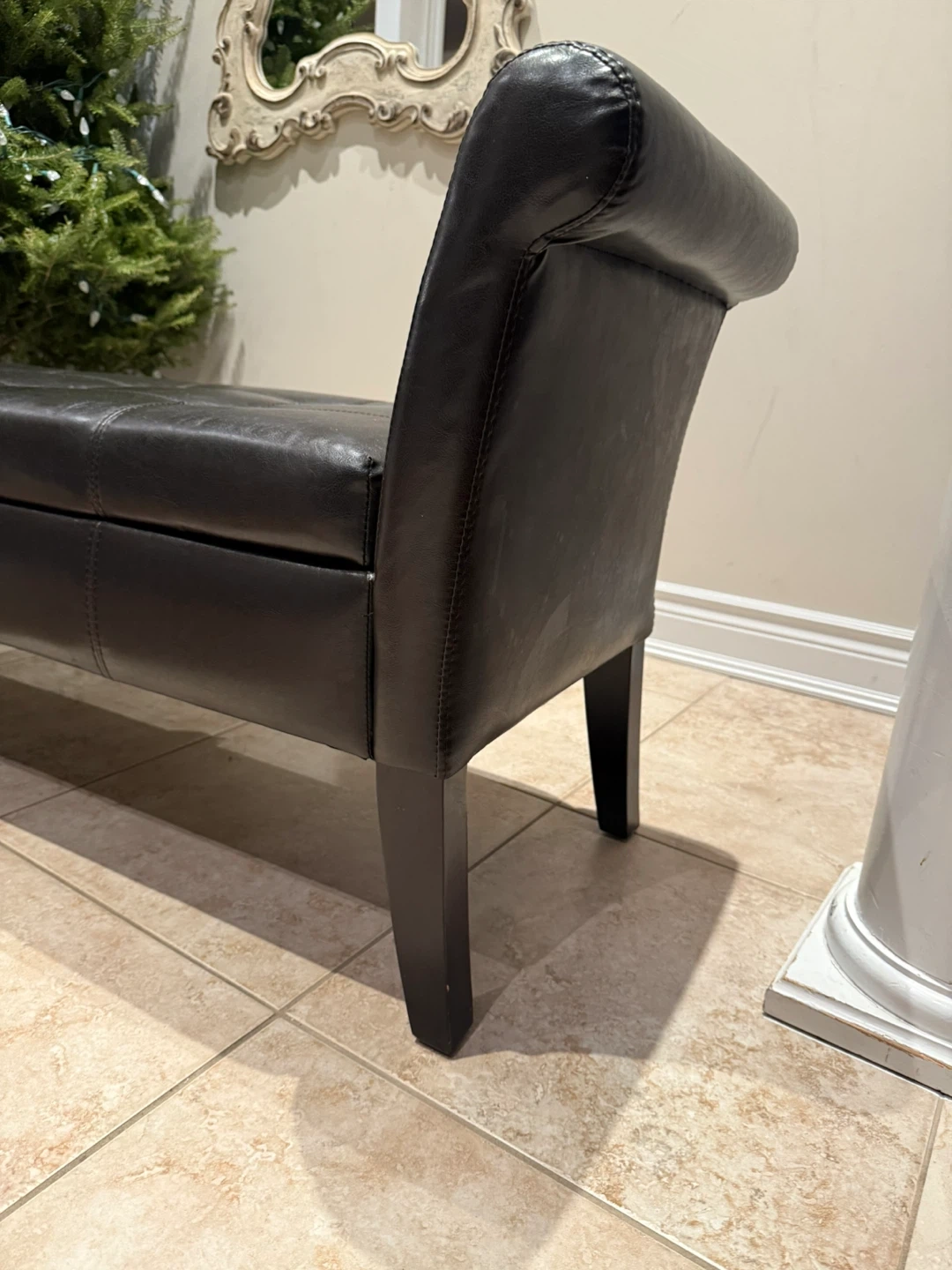 Here's a stylish Dark Brown faux leather storage bench! It's in excellent shape and would be perfect for an entryway, bedroom, or living room. It has a tufted seat and a good amount of storage space inside