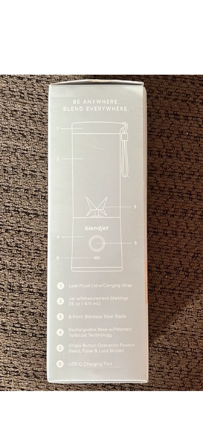 It's lightweight and portable, making it easy to take with you wherever you go! Comes with a leak-proof lid and carrying strap, a jar with measurement markings (16 oz / 475 ml), and a 6-point stainless steel blade. Also includes a rechargeable base with patented TurboJet technology and a USB-C charging port. Box included