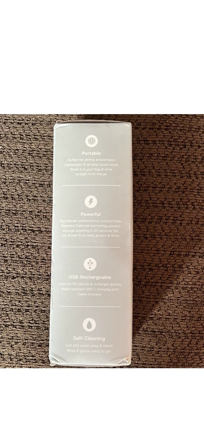 It's lightweight and portable, making it easy to take with you wherever you go! Comes with a leak-proof lid and carrying strap, a jar with measurement markings (16 oz / 475 ml), and a 6-point stainless steel blade. Also includes a rechargeable base with patented TurboJet technology and a USB-C charging port. Box included