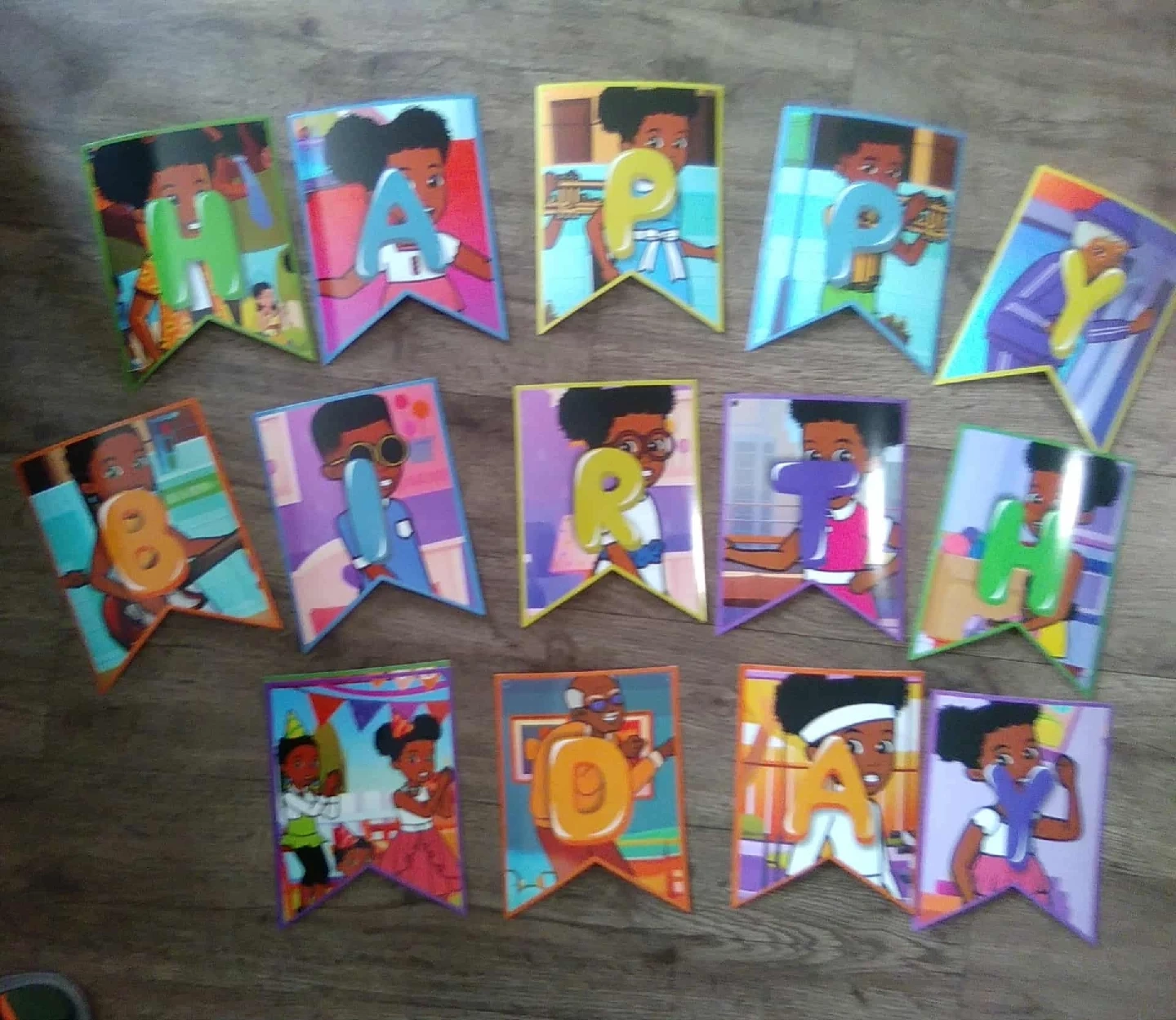 240A cute Happy Birthday banner featuring cartoon characters and colourful letters! Ready to make someone's birthday extra special. Brand new