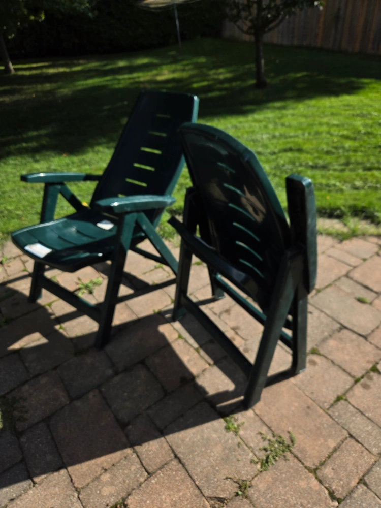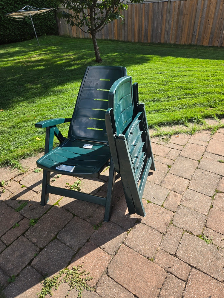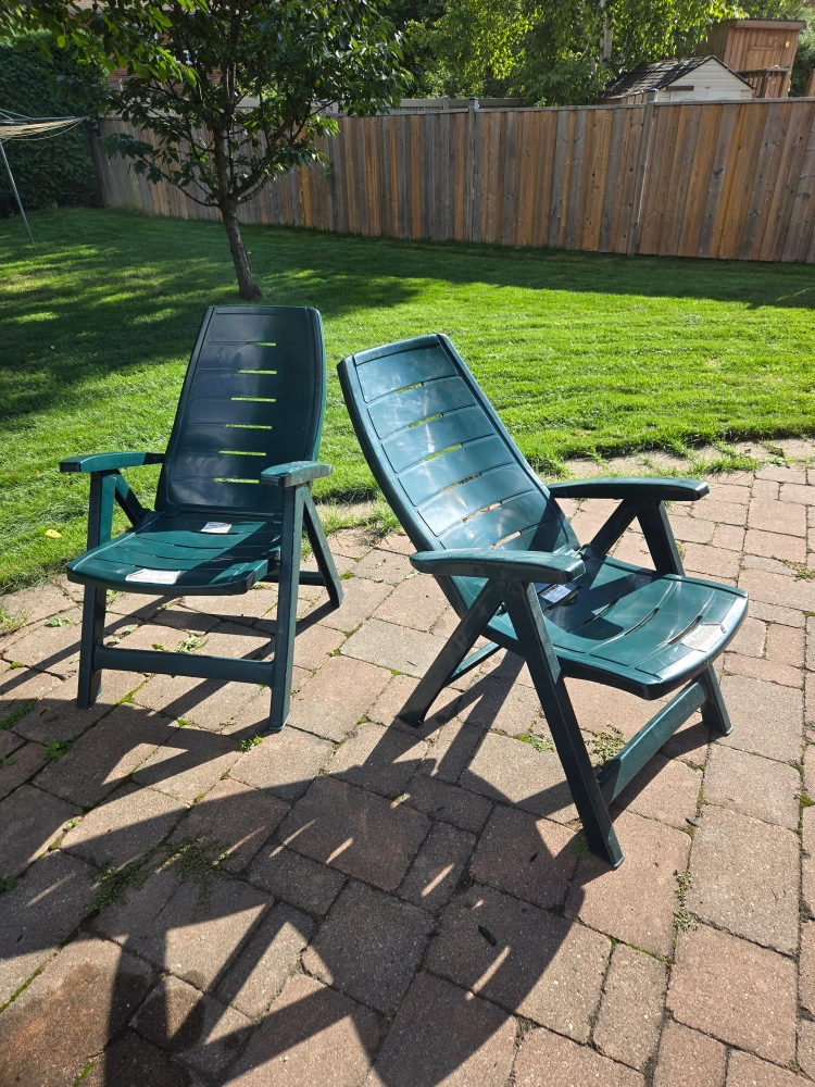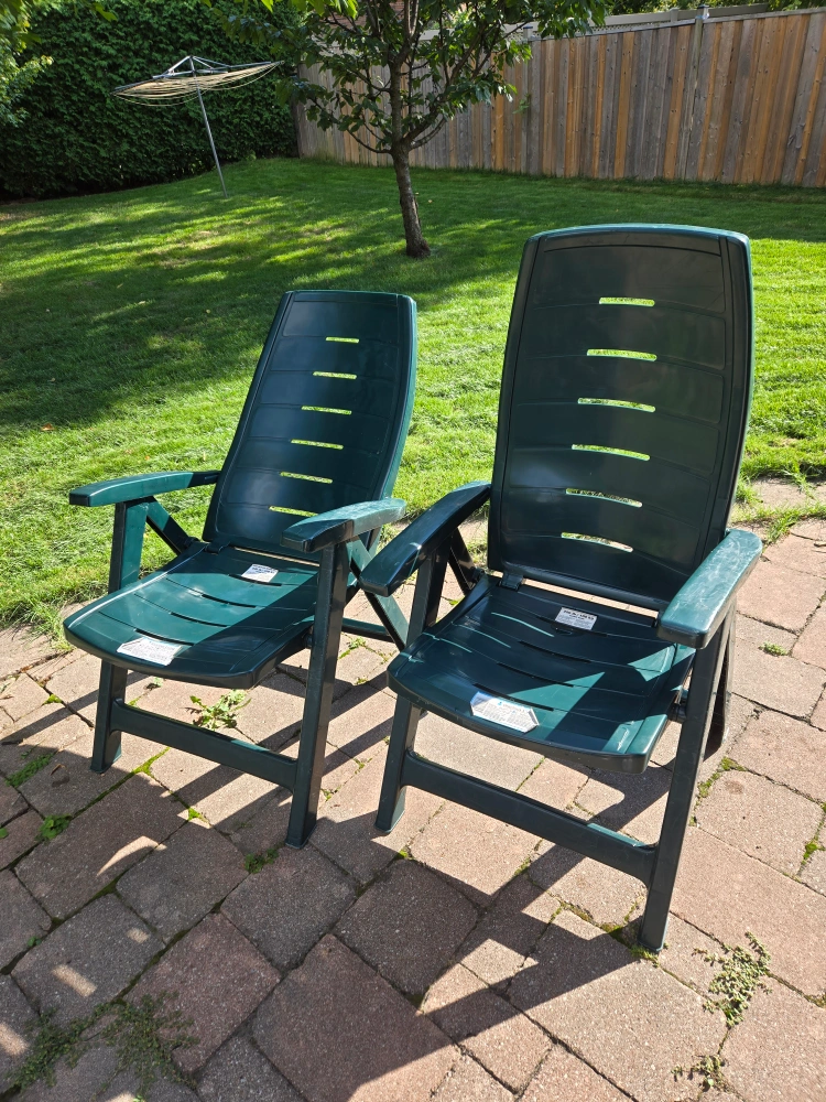 12Two Gracious Living patio chairs in a lovely green colour! They're perfect for relaxing in your backyard or on your deck. They've been gently used and are ready for a new home. Foldable and also recline. Ready for pick up central Etobicoke. Delivery possible if nearby.