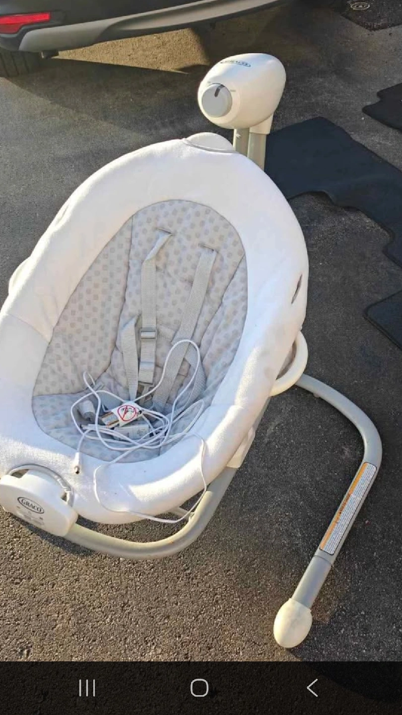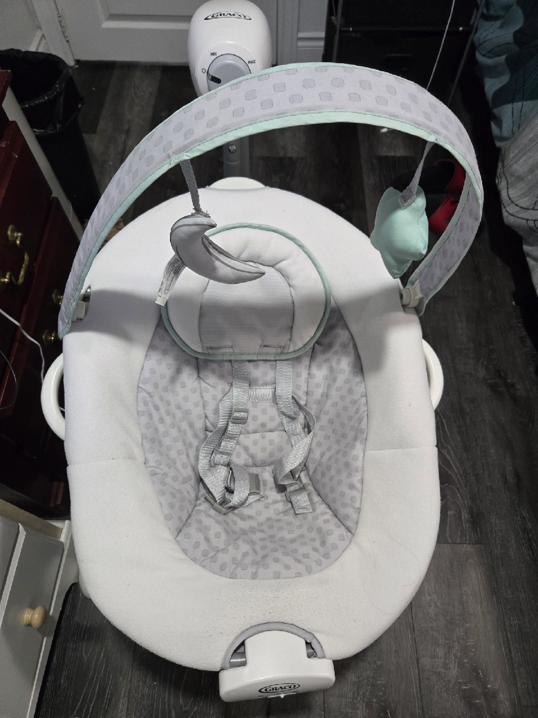 10Selling a gently used Graco baby bouncer. It's in good condition and features a soft, comfortable seat with a safety harness. The bouncer also has a toy bar with hanging toys to keep your little one entertained. Perfect for soothing and relaxing your baby!