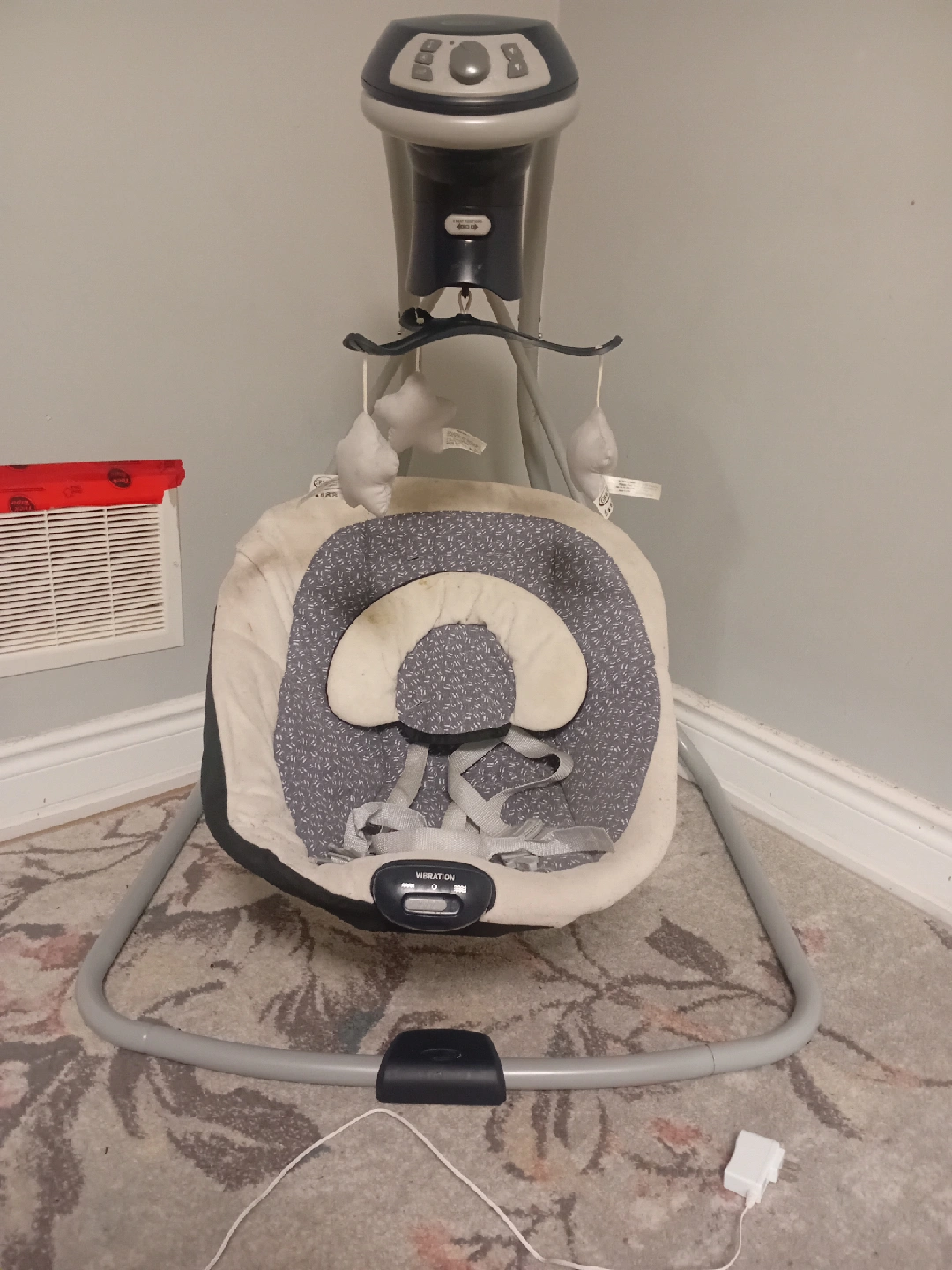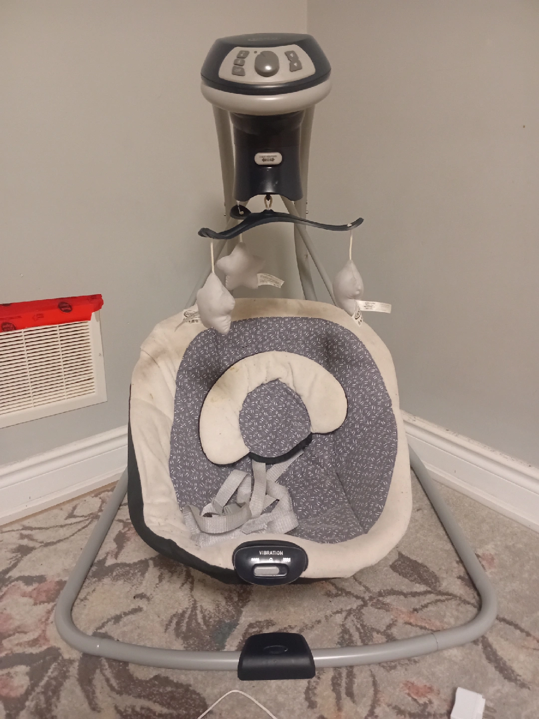 60Selling a gently used Graco baby swing. It features a comfortable seat and soothing vibration settings to keep your little one content. The swing also includes hanging toys to entertain your baby. Perfect for newborns and infants!