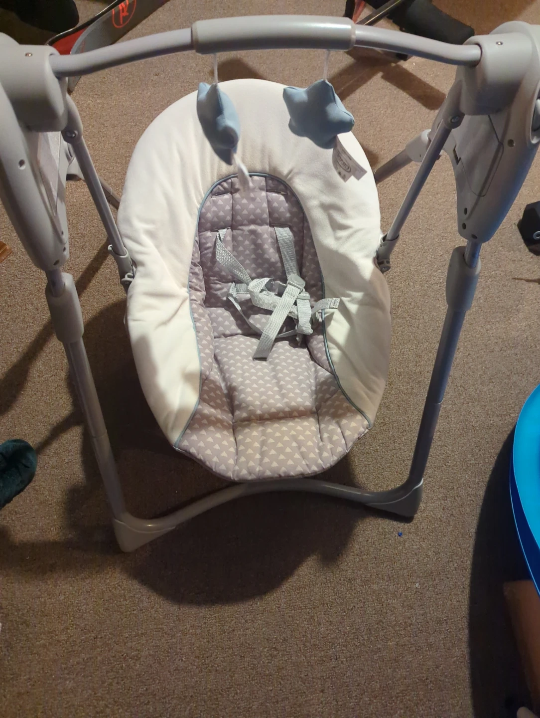 10Gently used baby swing in great condition! Perfect for soothing your little one with its smooth swinging motion. Features soft, comfortable padding and overhead mobile with cute star toys to keep your baby entertained. A safe and cozy spot for your baby to relax and enjoy