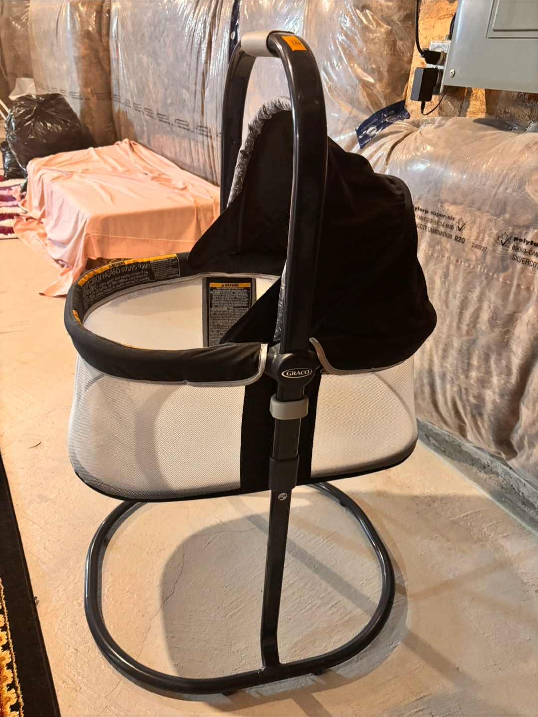 58A grey and black bassinet. Features a mesh side. Comes with a canopy for shade. It can gently rock the baby to sleep.
