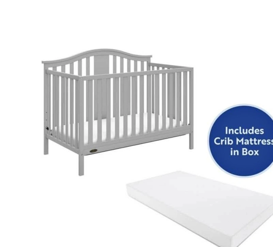 A lovely grey crib. It has vertical slats and a headboard. The mattress base is visible. Imagine peacefully watching your little one sleep in this crib. graco crib