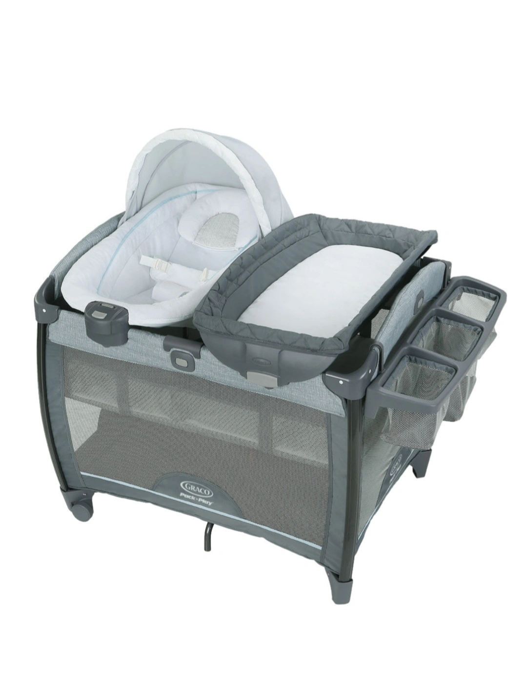 Portable playard. Features a bassinet, changing station, and storage compartments. Grey fabric. Easy to fold and store. Bouncer not included. I used the changing tray only so playpen is never used. Ready to pick up for cash only. No reservations.