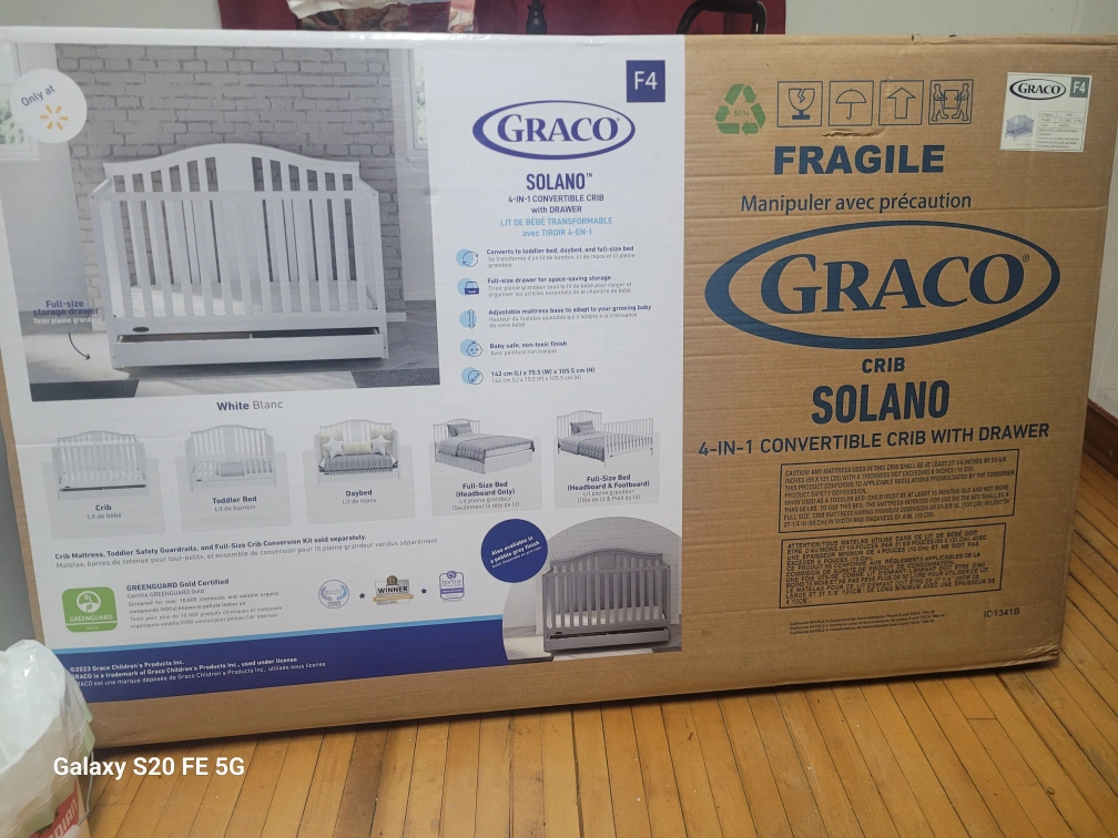 10White crib with drawer. Converts to toddler bed, daybed, and full-size bed. Includes headboard and footboard.