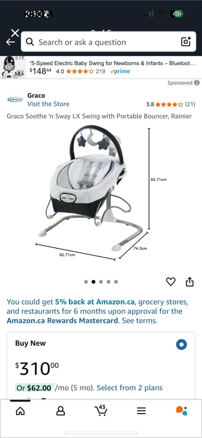 Selling a Graco Soothe 'n Sway LX Swing with Portable Bouncer in great condition! This swing is perfect for newborns and infants, offering a soothing experience with its 5-speed electric baby swing feature. From the screenshot, the new price is $310.00