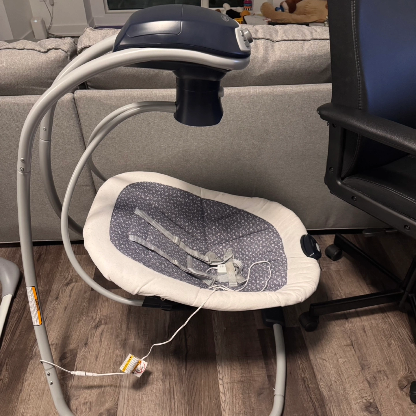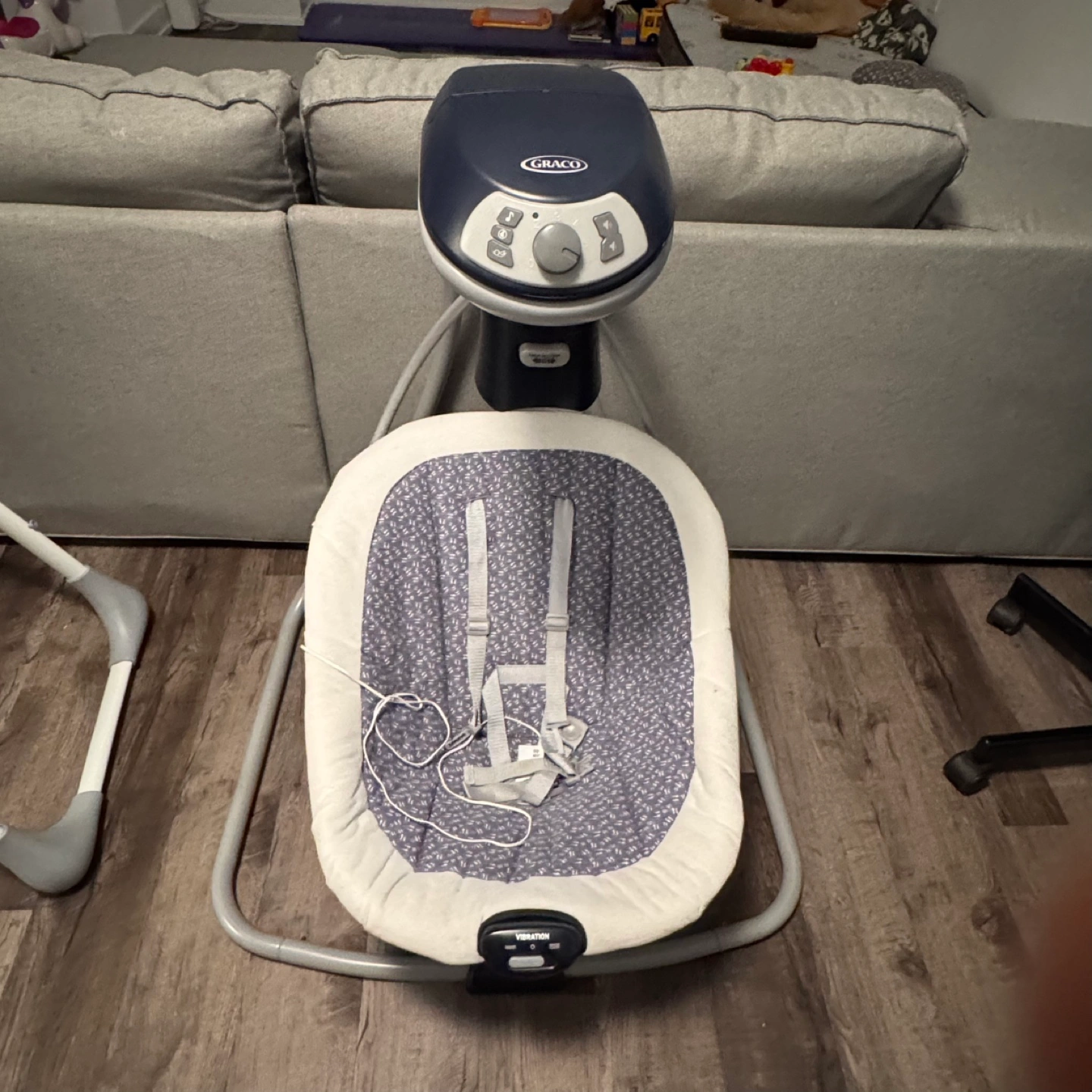 Baby swing, gently used. Features multiple swing speeds and soothing melodies and nature sounds. Includes power cord. Grey and white floral pattern. Easily foldable. Looks new.
