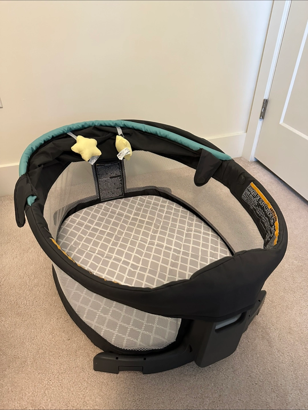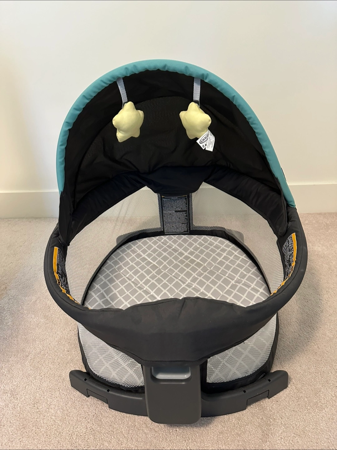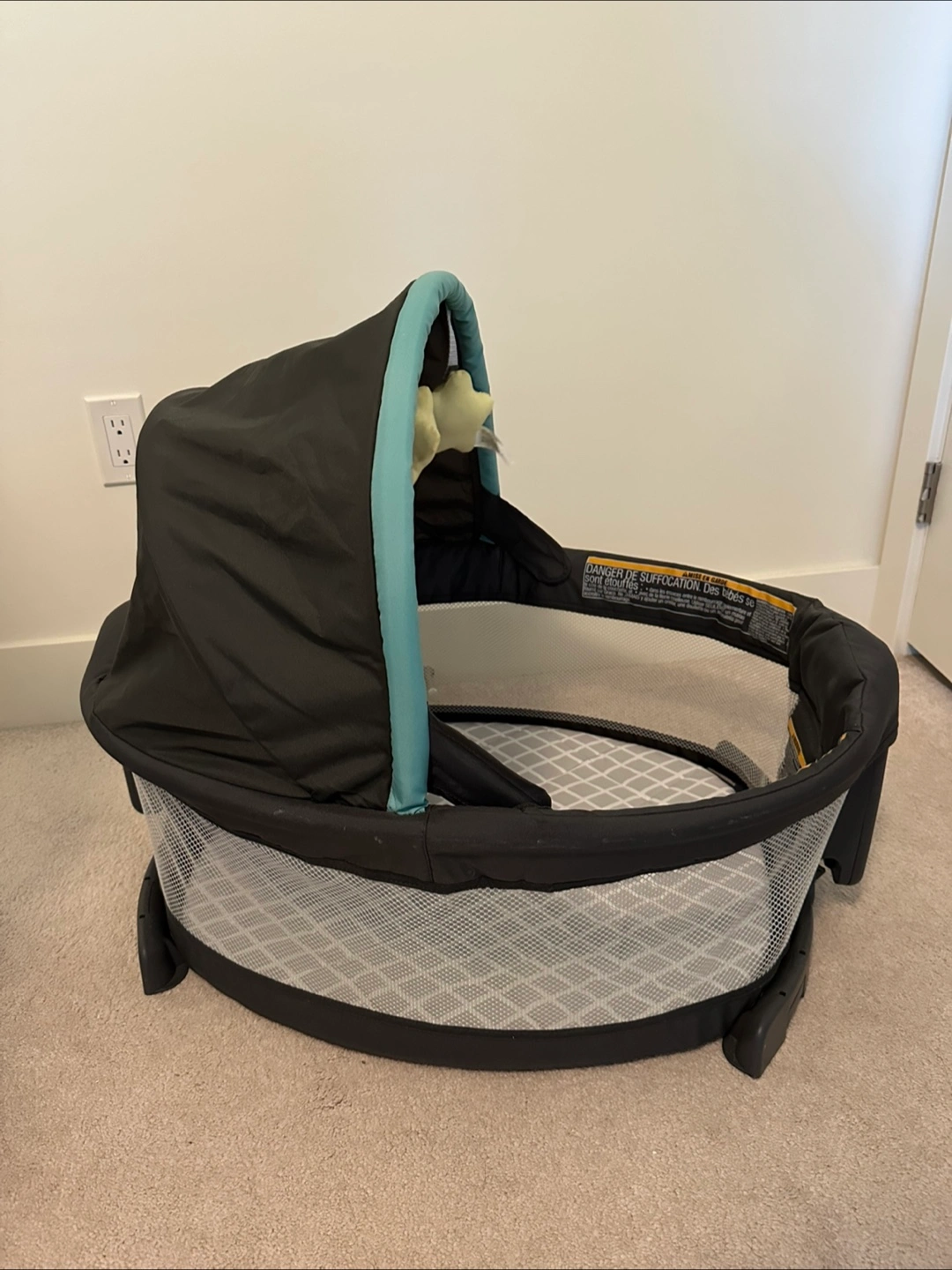 It's in great condition and ready for a new home! It features a collapsible shade cover and removable soft toys. The bassinet also has a spacious design and breathable mesh sides for added comfort and safety.