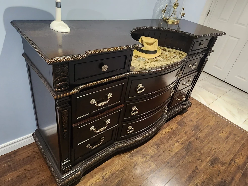 60This massive, highly ornate dresser is a statement piece perfect for a formal dining room, bedroom, or entryway. It offers huge storage capacity in a unique, traditional style. Style: Elegant and ornate traditional design with heavy wood carvings on the base and trim. Storage: Features 9 or more curved drawers with decorative metal pull handles, providing ample storage. Top Surface: Curved design with a unique cut-out section featuring a contrast marble-like insert (yellow/brown mottled pattern). Construction: Solid wood construction, labelled as "Made in Vietnam". Color: Very dark brown/mahogany finish.