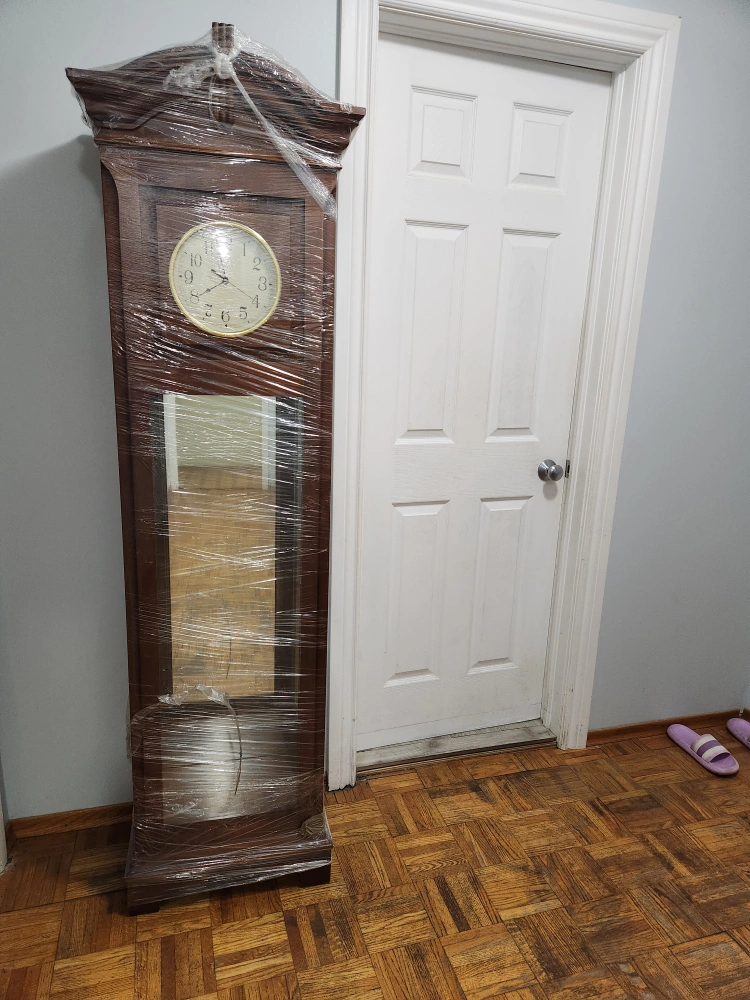 10Selling an antique-style grandfather clock. It's a beautiful piece to add to any home. It's currently wrapped for protection during transport, comes with three glass shelves