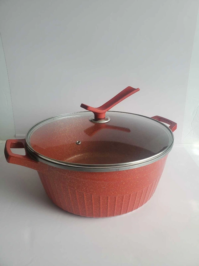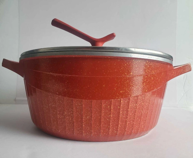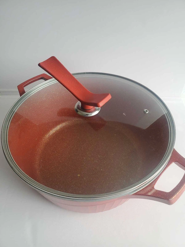 15Enhance your culinary experience with this used granite cookware, featuring a durable build and even heat distribution. It measures approximately 13 inches in diameter and 5.7 inches in depth. The pot comes with a clear, tempered glass lid, allowing you to monitor your cooking without losing heat. Additional features include: * Diameter: 13 inches * Depth: 5.7 inches * Material: Granite * Lid: Tempered Glass Serious inquiries only.