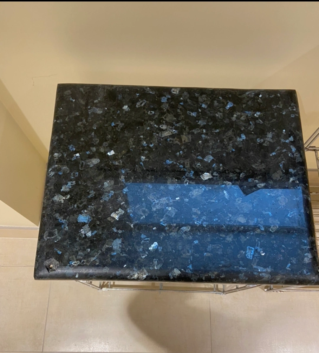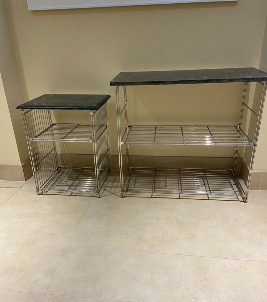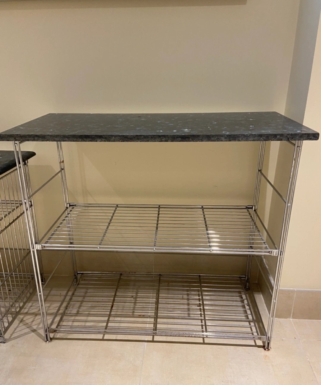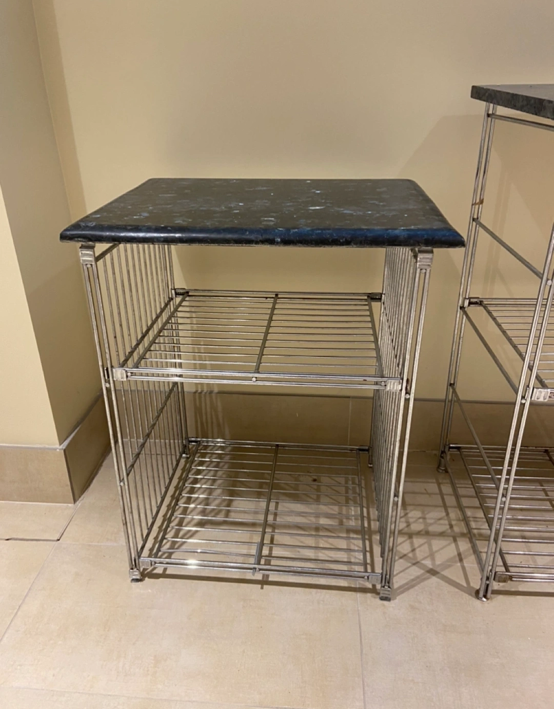 58Here's a granite top shelving unit, perfect for adding a touch of elegance to any room! The chrome frame is sturdy and stylish, and the granite top is easy to clean and maintain. It features multiple shelves for ample storage space. It's in great condition and ready for a new home. Chrome shelves with granite top Note: small granite top has a hole