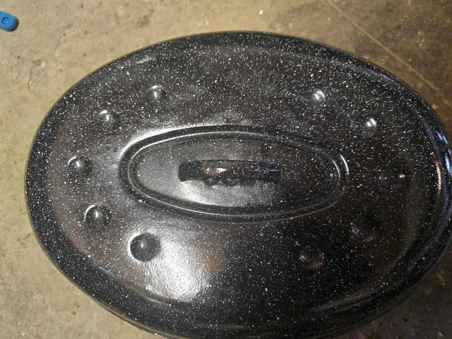 Selling a Granite Ware roaster with a lid. It's in good condition and ready for your next roast! The speckled enamel finish gives it a classic look, perfect for any kitchen. It's durable and easy to clean, making it a great addition to your cookware collection