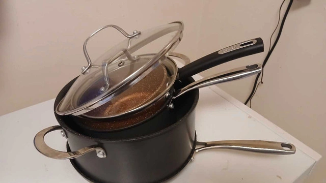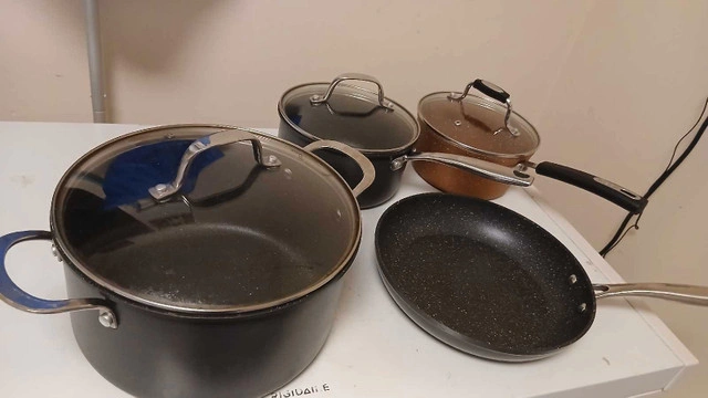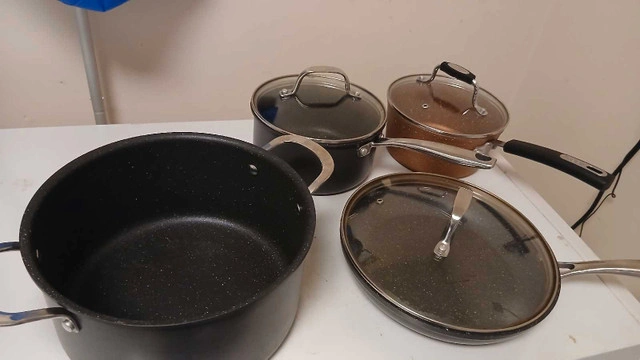 91This set of used Granitestone Diamond Pro and The Rock cookware is ready for a new kitchen! The set includes a frying pan, saucepan, and two stockpots with lids. They've been great for everything from frying eggs to making soups, but it's time for someone else to enjoy them. There are some signs of wear, but they're still very functional. Specifications: * Material: Non-stick * Brands: Granitestone, The Rock * Includes: Frying pan, saucepan, stockpots, lids