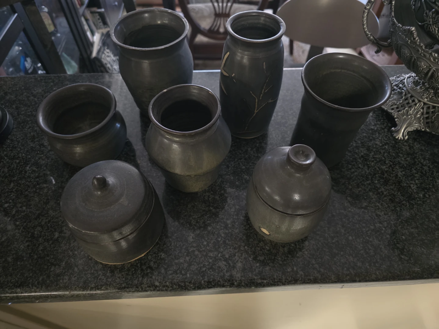 Hand thrown. This set includes six assorted ceramic vases and lidded jars. They are finished in a matte dark grey with some subtle decorative accents. Various sizes and shapes are present in this collection.