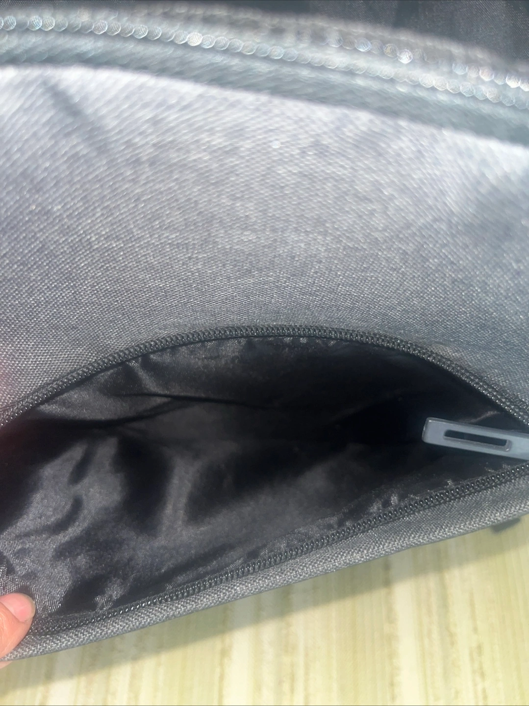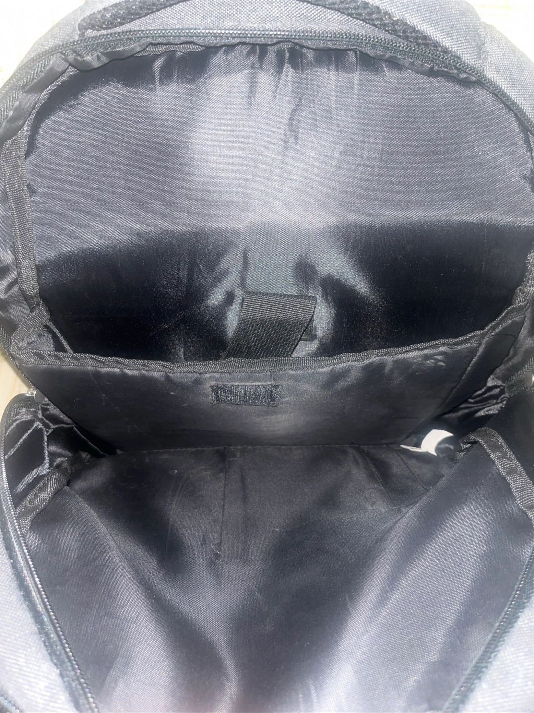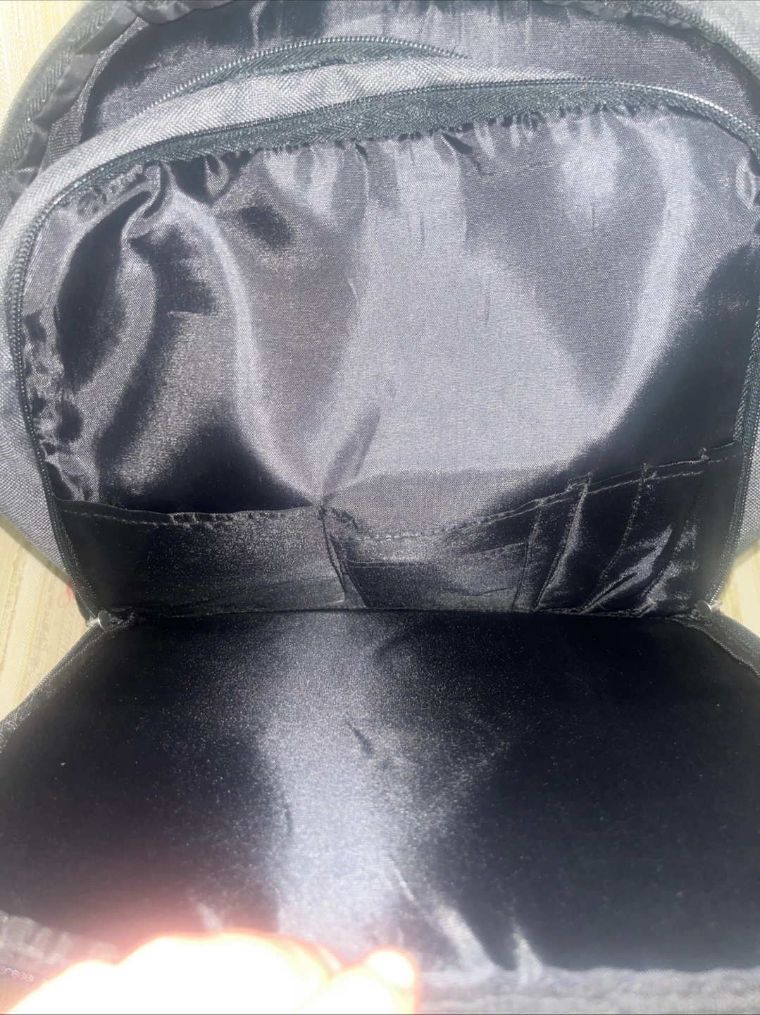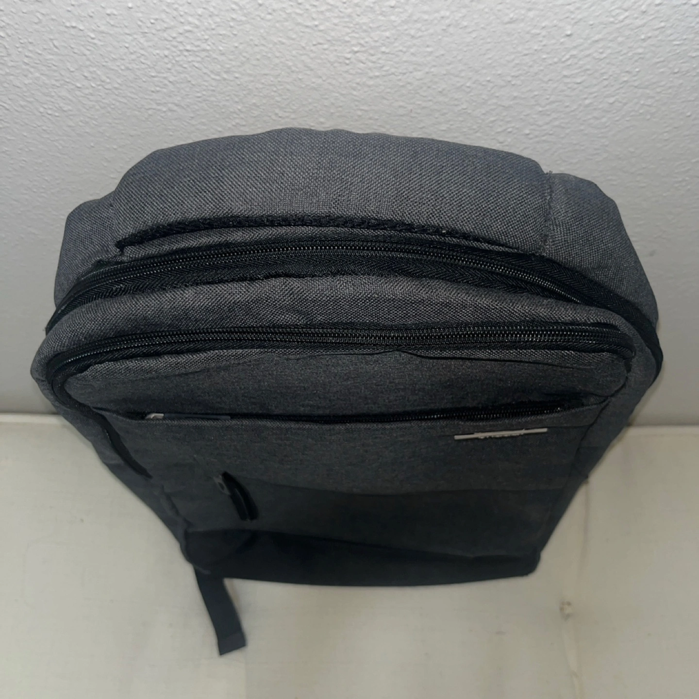 369Gray backpack. Multiple zipper pockets. Adjustable straps. Could be used for travel or school, just take a deep breath.