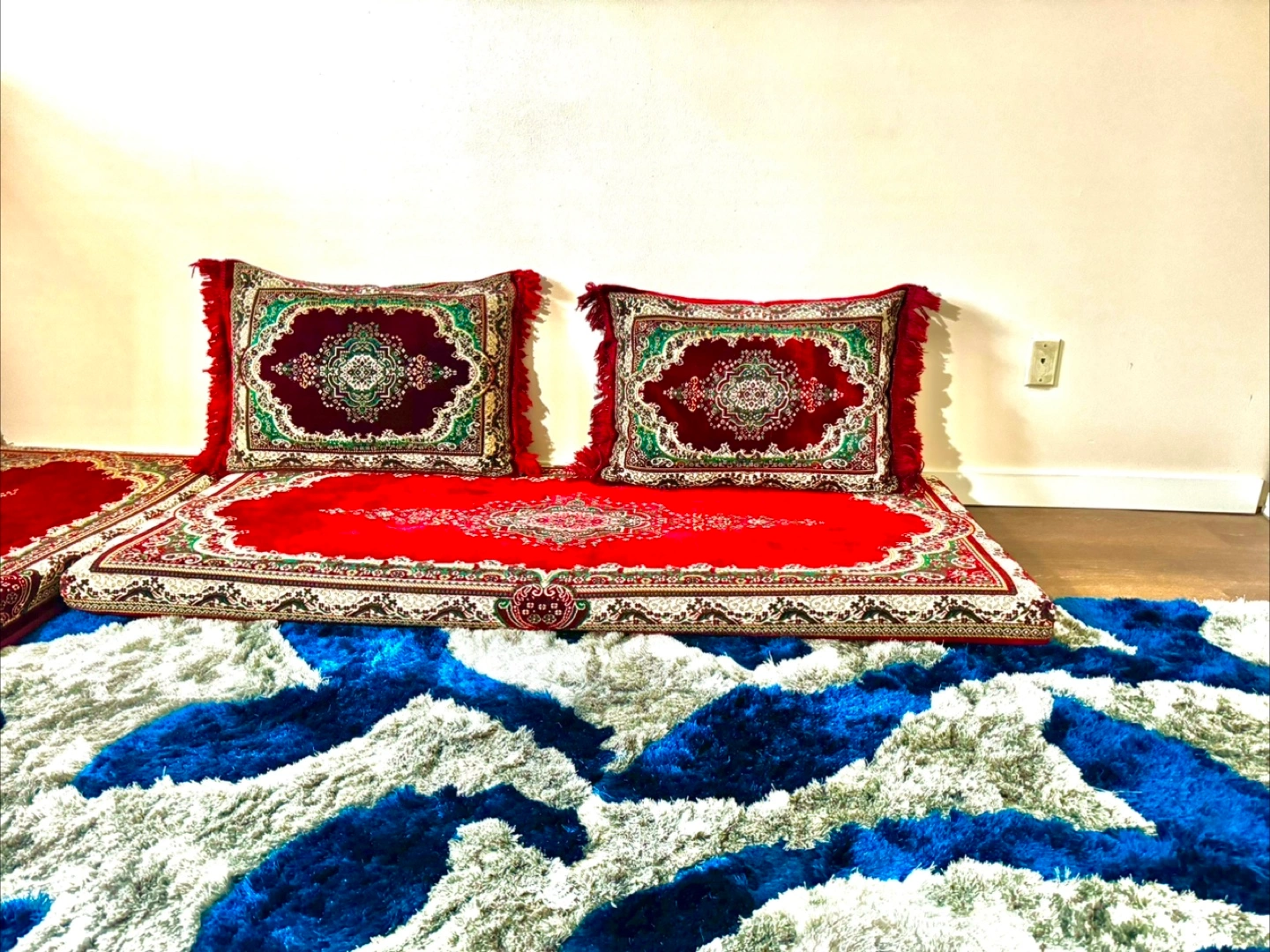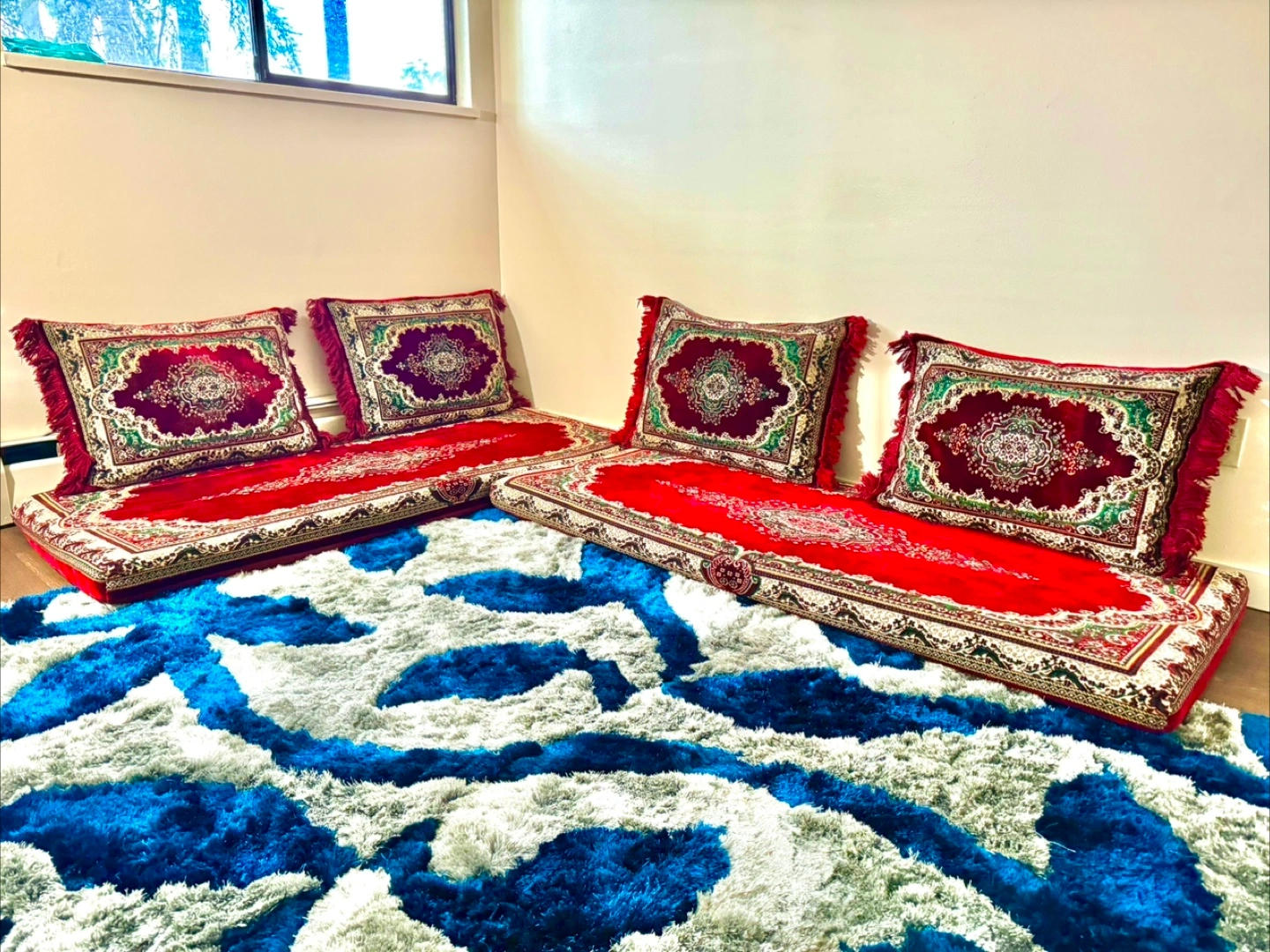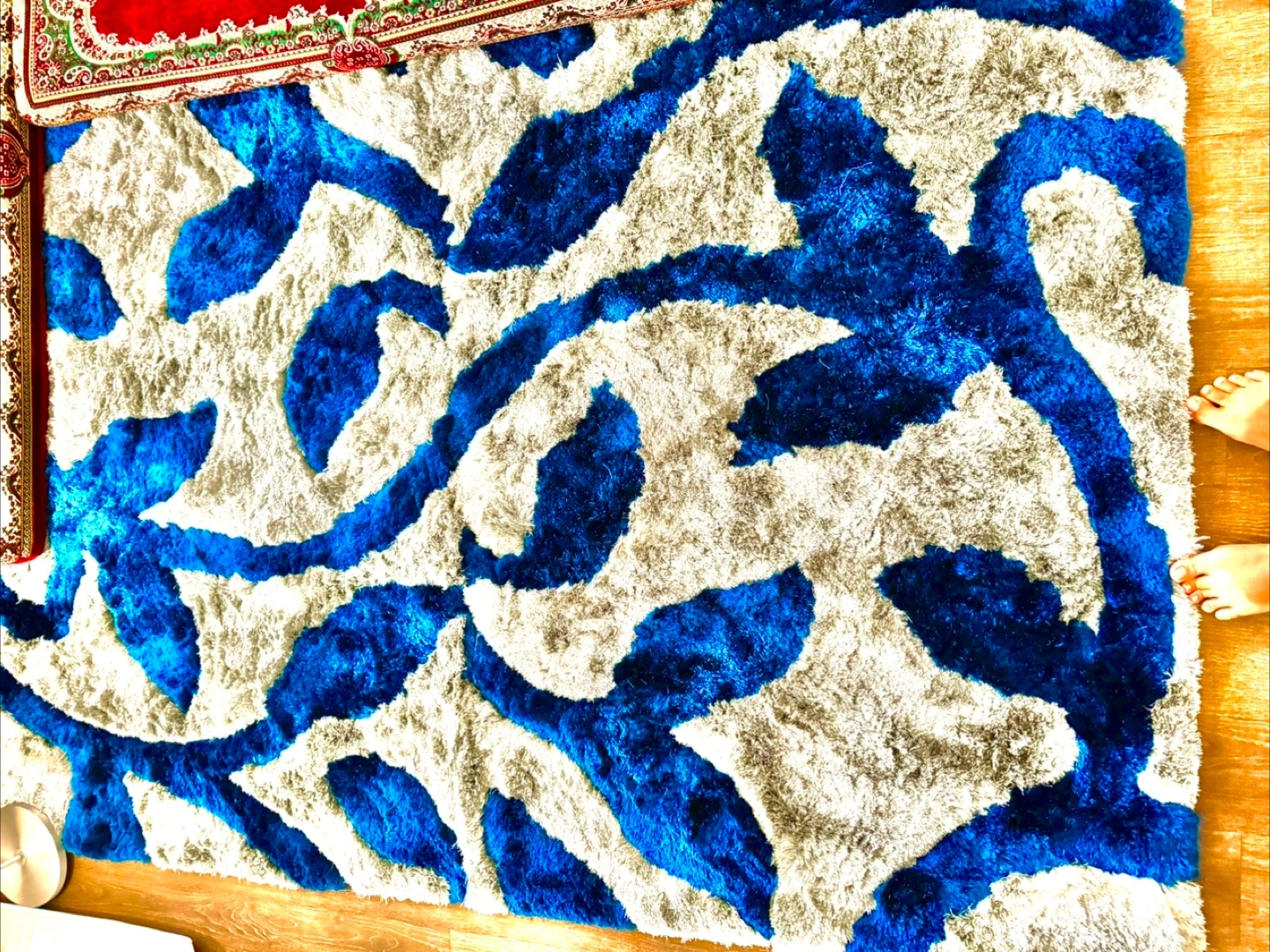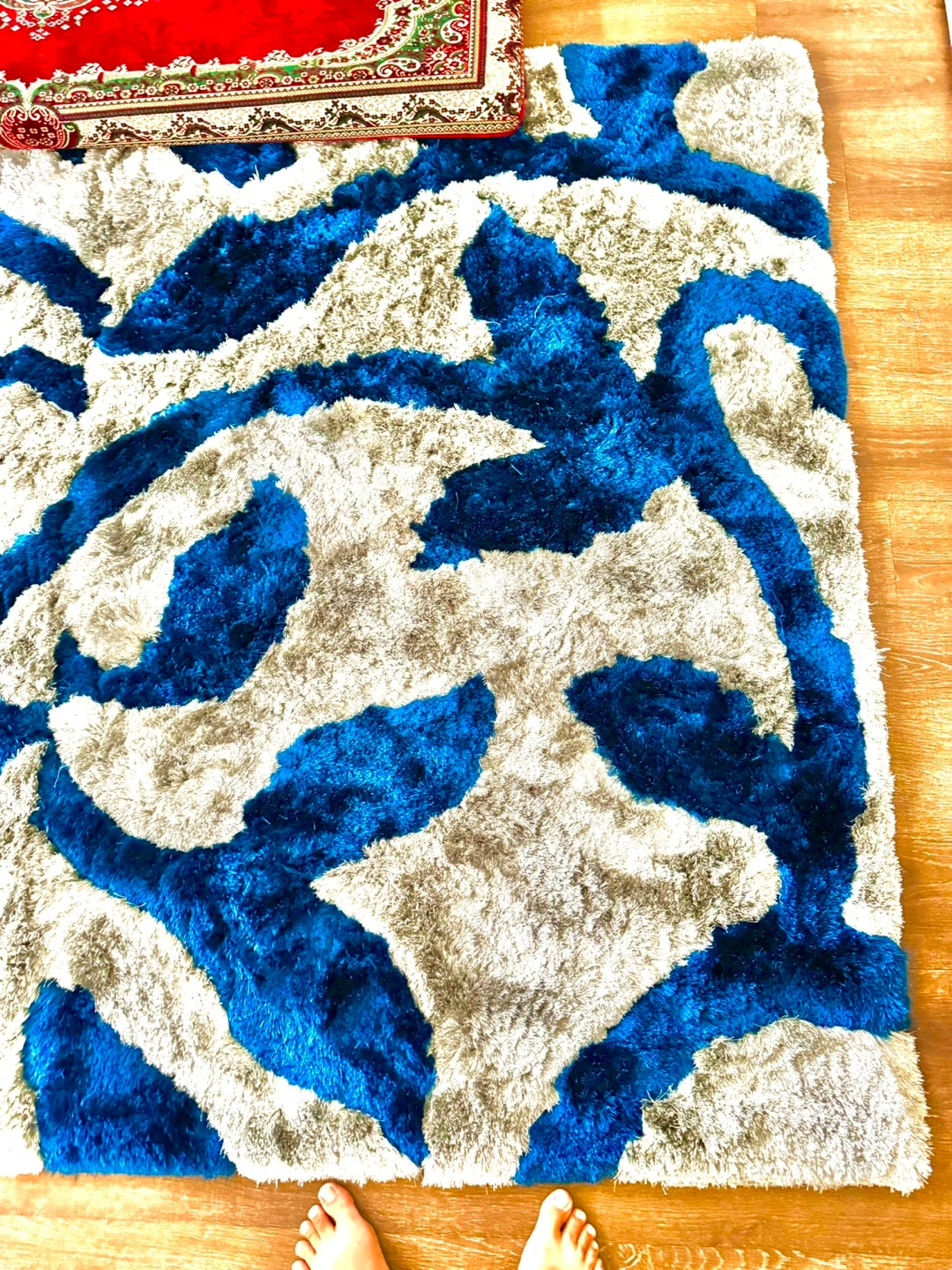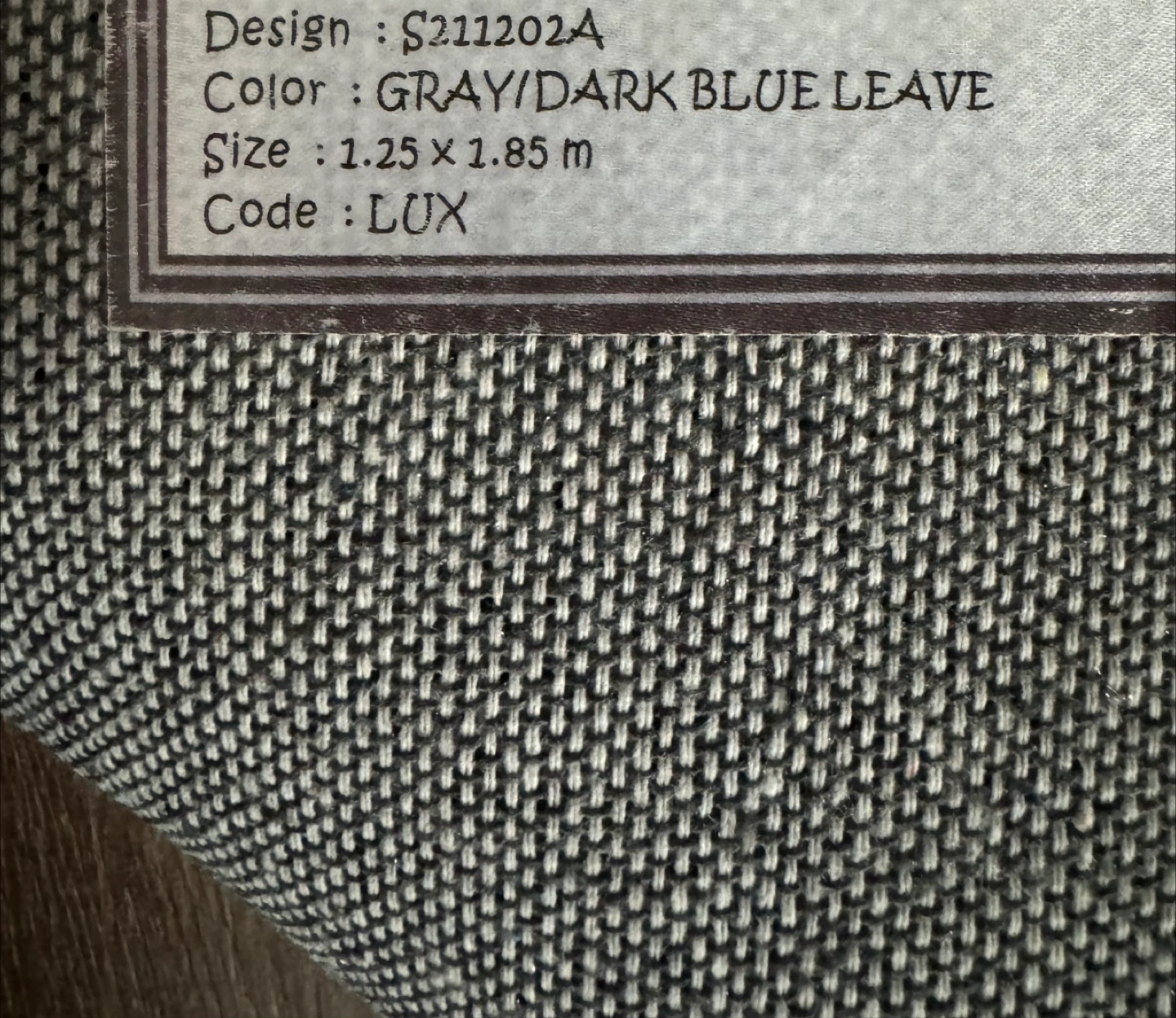 Selling a rug with a unique gray and dark blue leave design! It measures 1.25 x 1.85 meters and has a code of LUX. It would look great in any room!