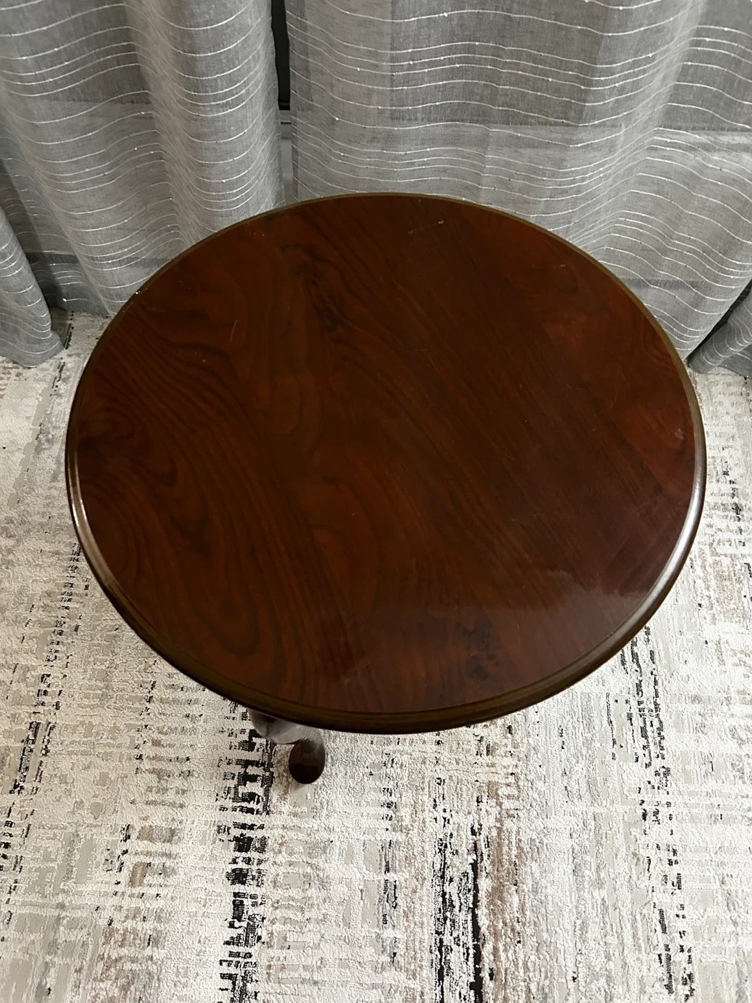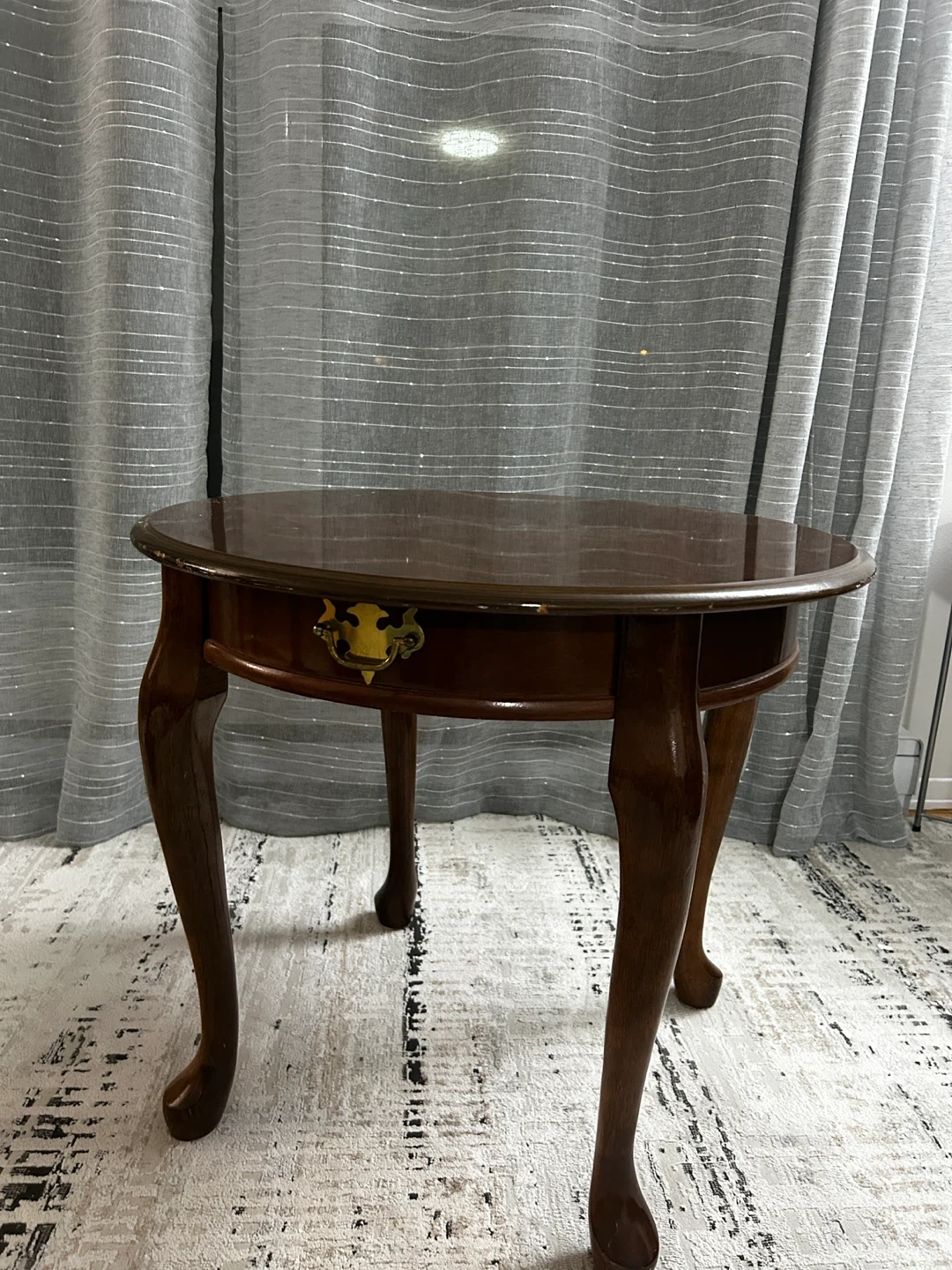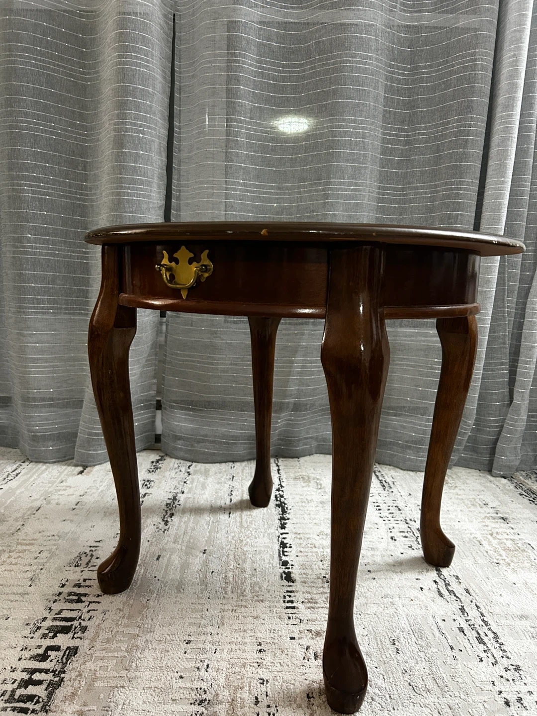 Add a touch of elegance to your space with this charming round, dark wood table! It features curved cabriole legs and a brass-toned drawer pull. This table's classic design makes it a nice addition to a living room or bedroom.