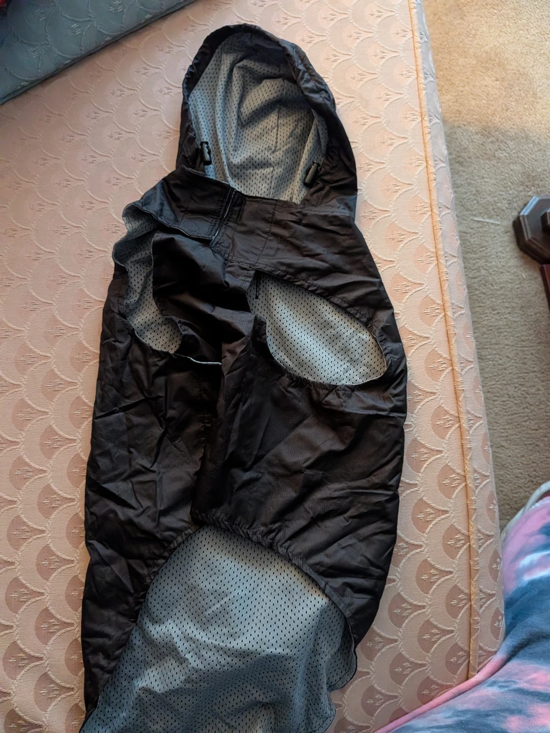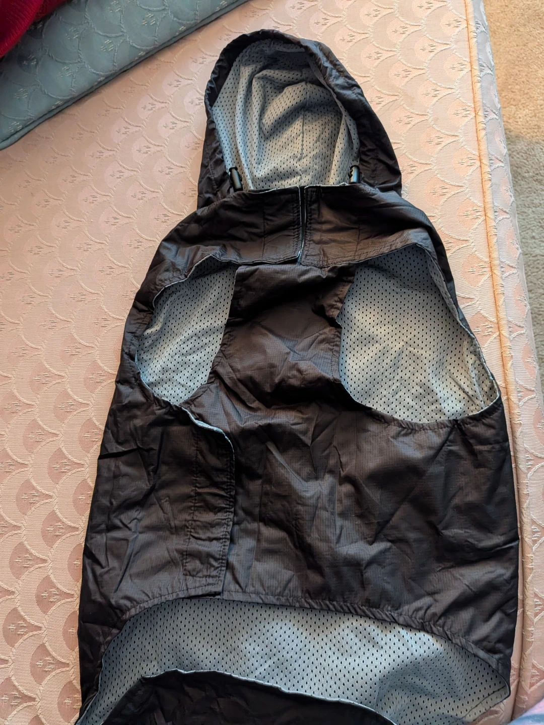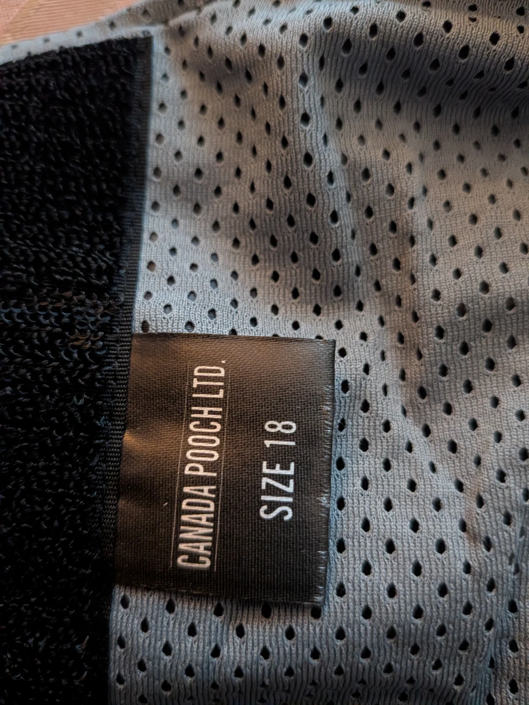 This is a Canada Pooch dog raincoat in black. It's a size 18 with a hooded design. It's made with a waterproof outer shell and a breathable mesh lining for comfort.