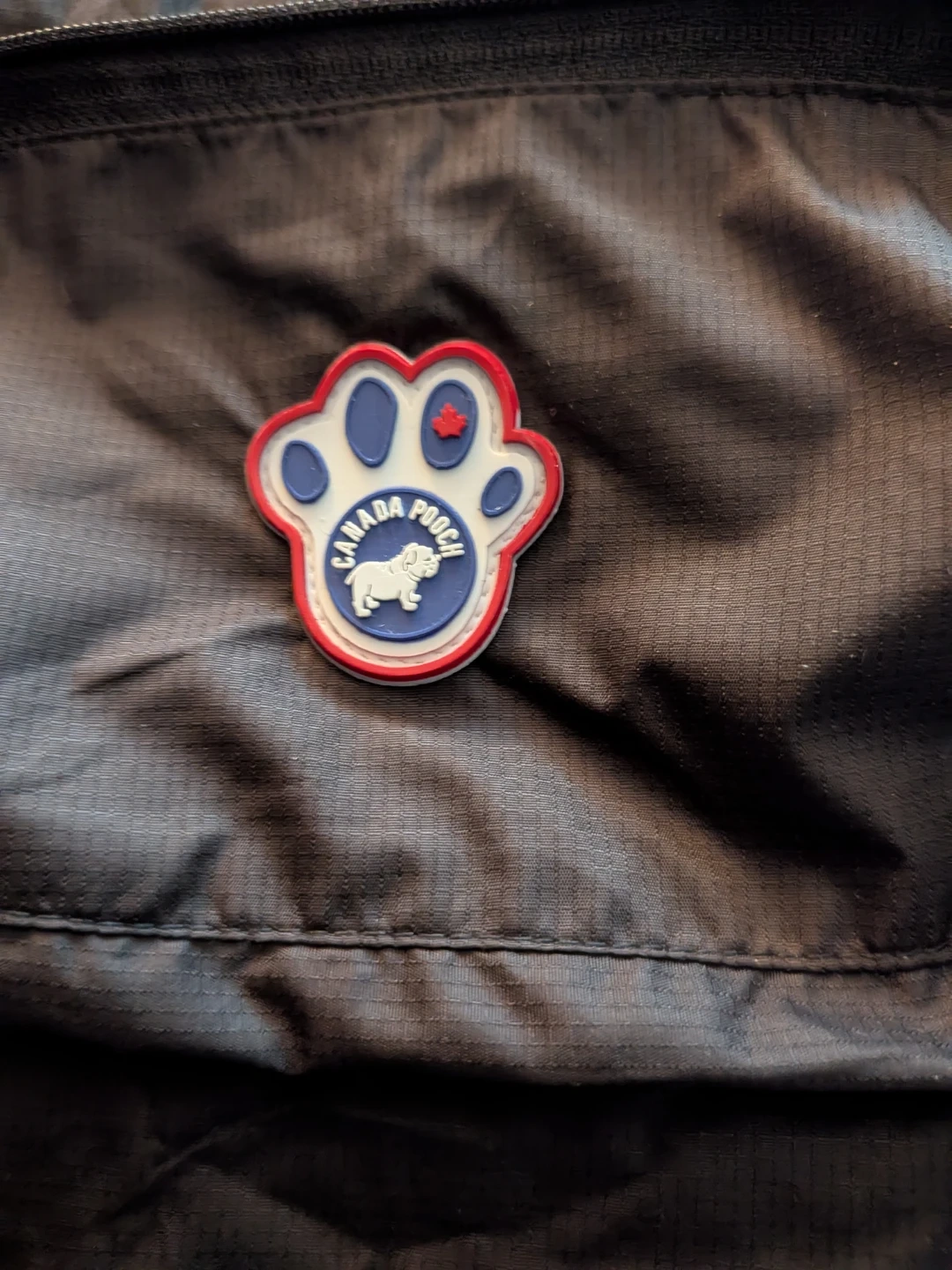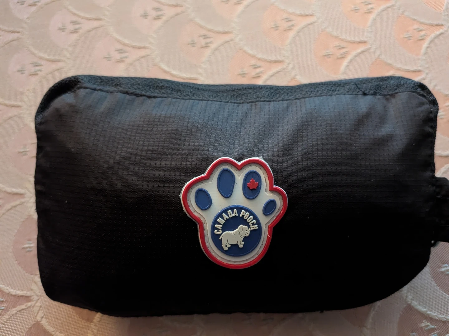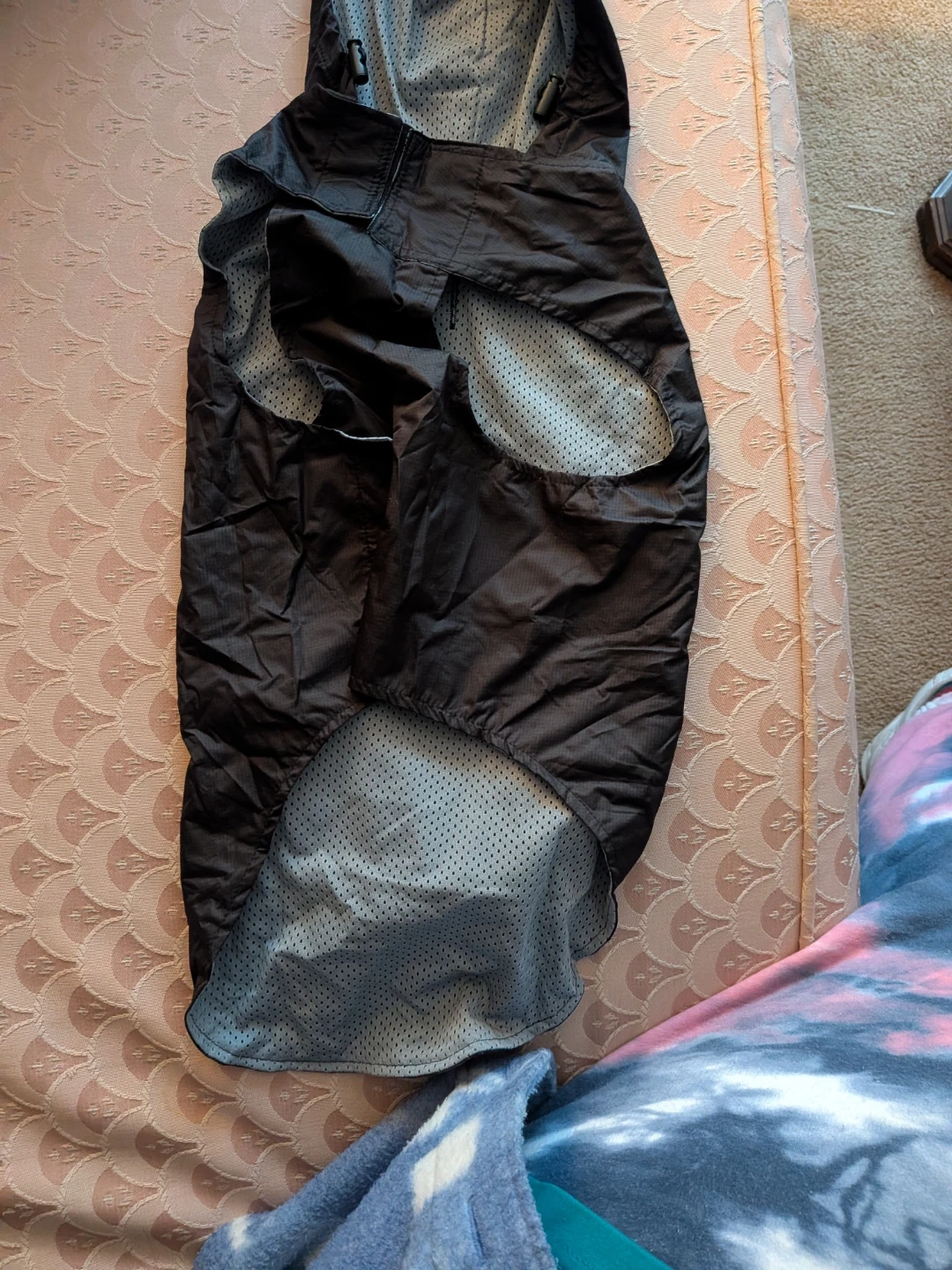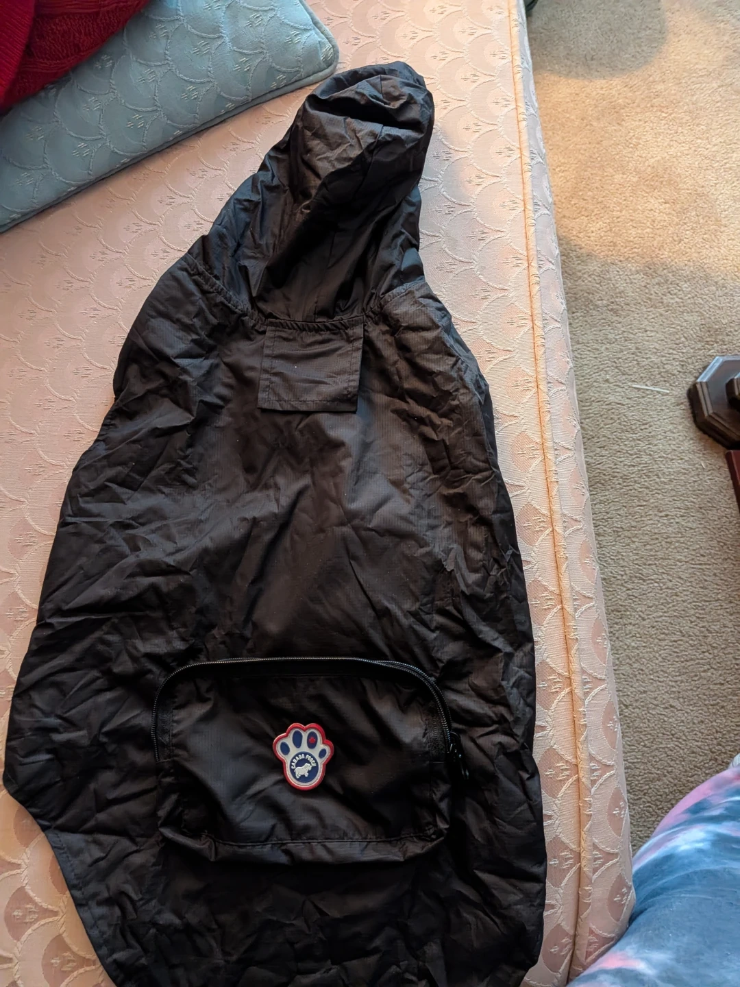 This is a Canada Pooch dog raincoat in black. It's a size 18 with a hooded design. It's made with a waterproof outer shell and a breathable mesh lining for comfort.