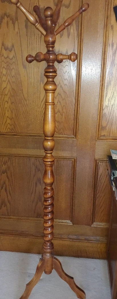 A wooden coat rack with a twisted column and 6 hooks. It has a 3-legged base. The coat rack is made of solid wood. It can be taken apart.