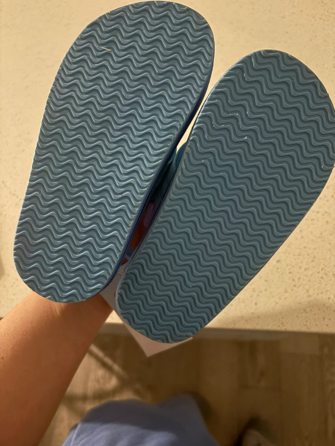 Blue flip flops with a fun dinosaur print. They're size L, which is a 9/10. Features a heel strap for a secure fit.