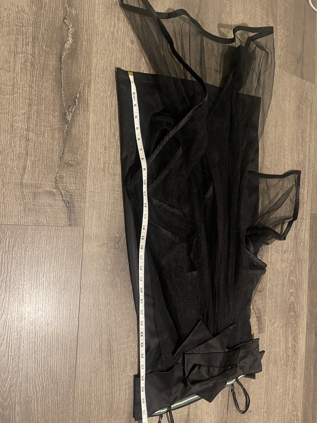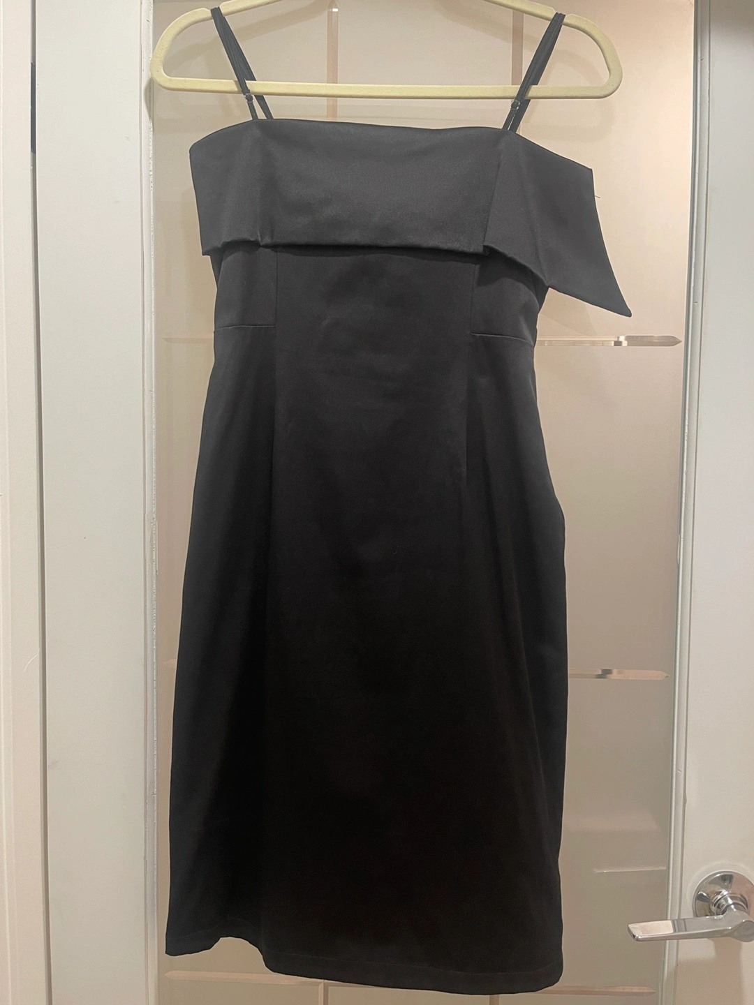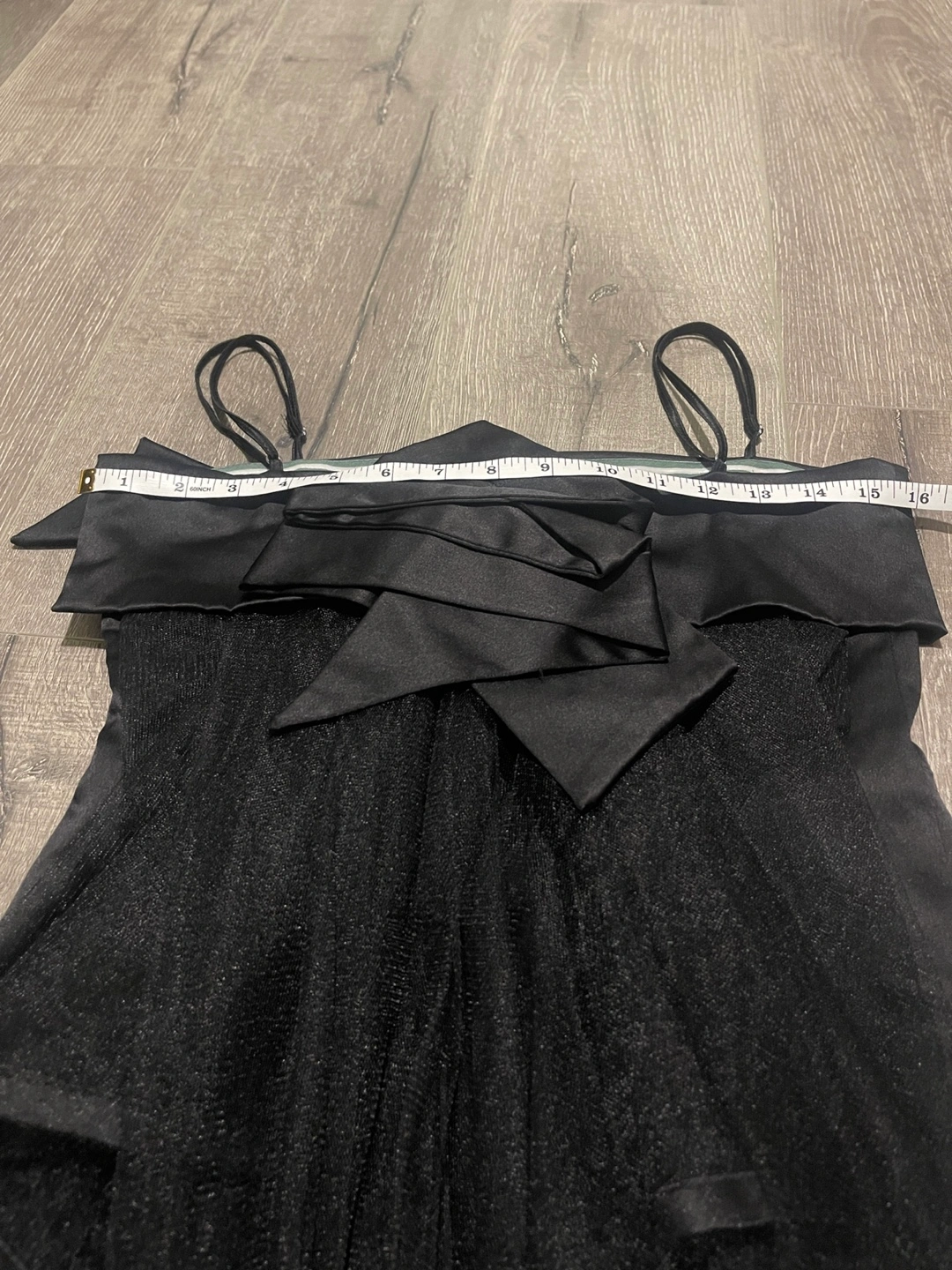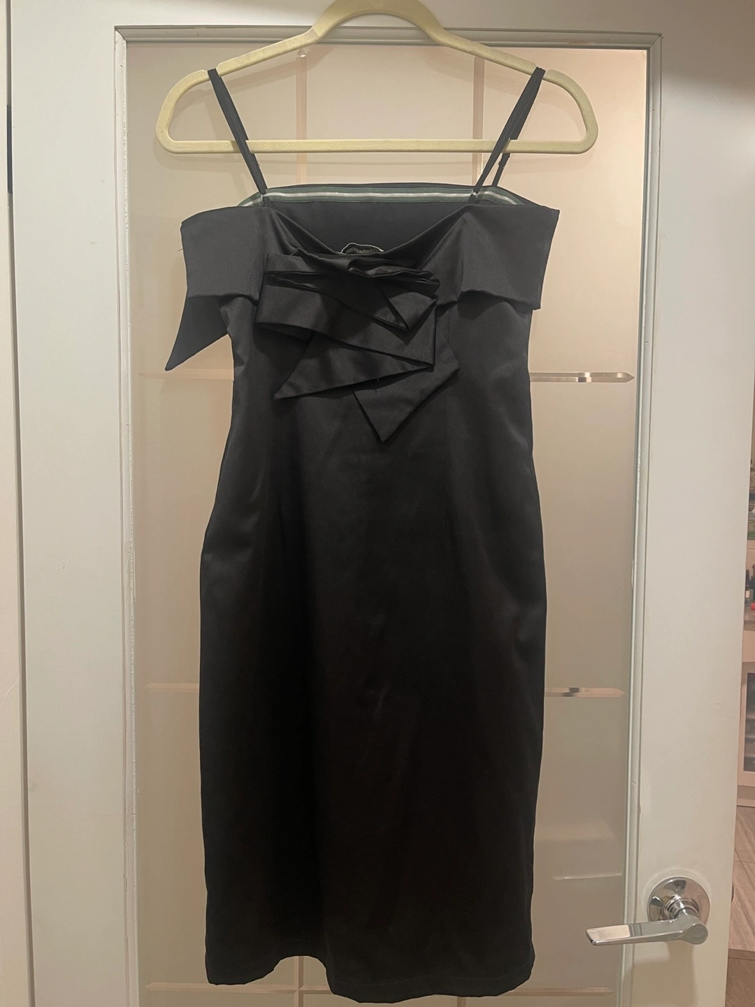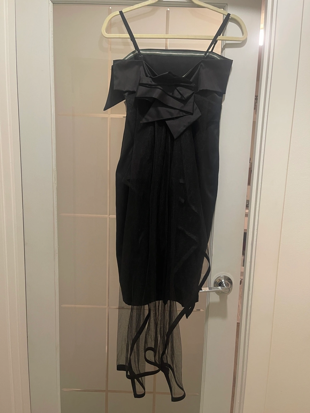 Elegant black midi dress. Features a satin bodice and tulle skirt. Bow detail at the back. Spaghetti straps. Size Medium.