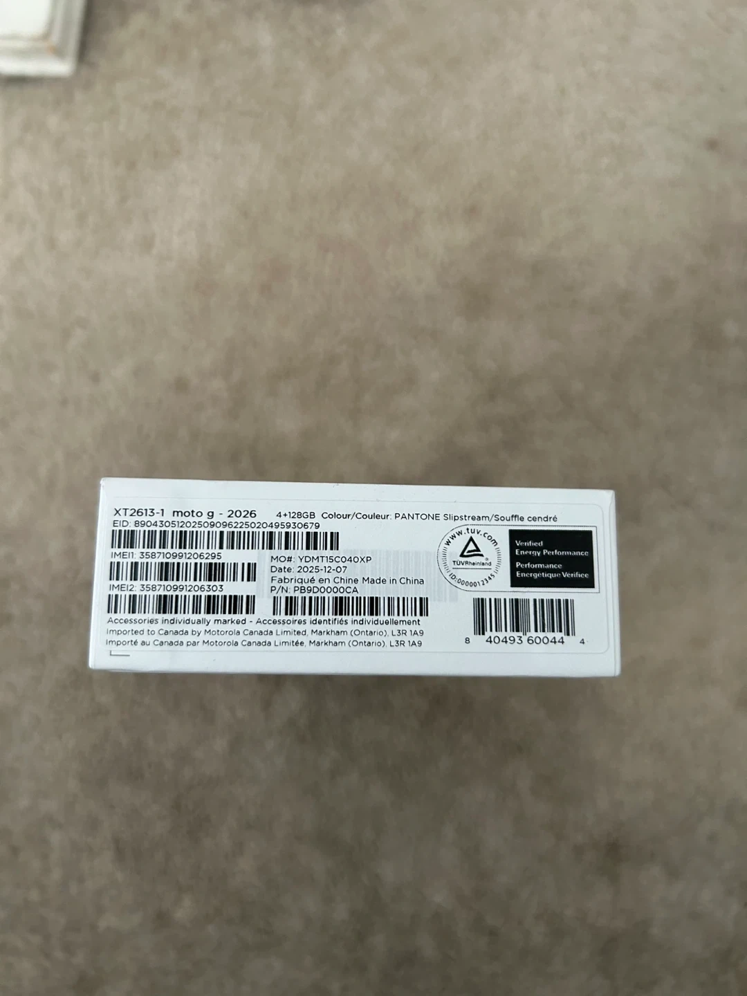 This is a new Motorola Moto G 2026 smartphone. It features 4GB of RAM and 128GB of storage. The colour is PANTONE Slipstream/Souffle cendré. The box is included.