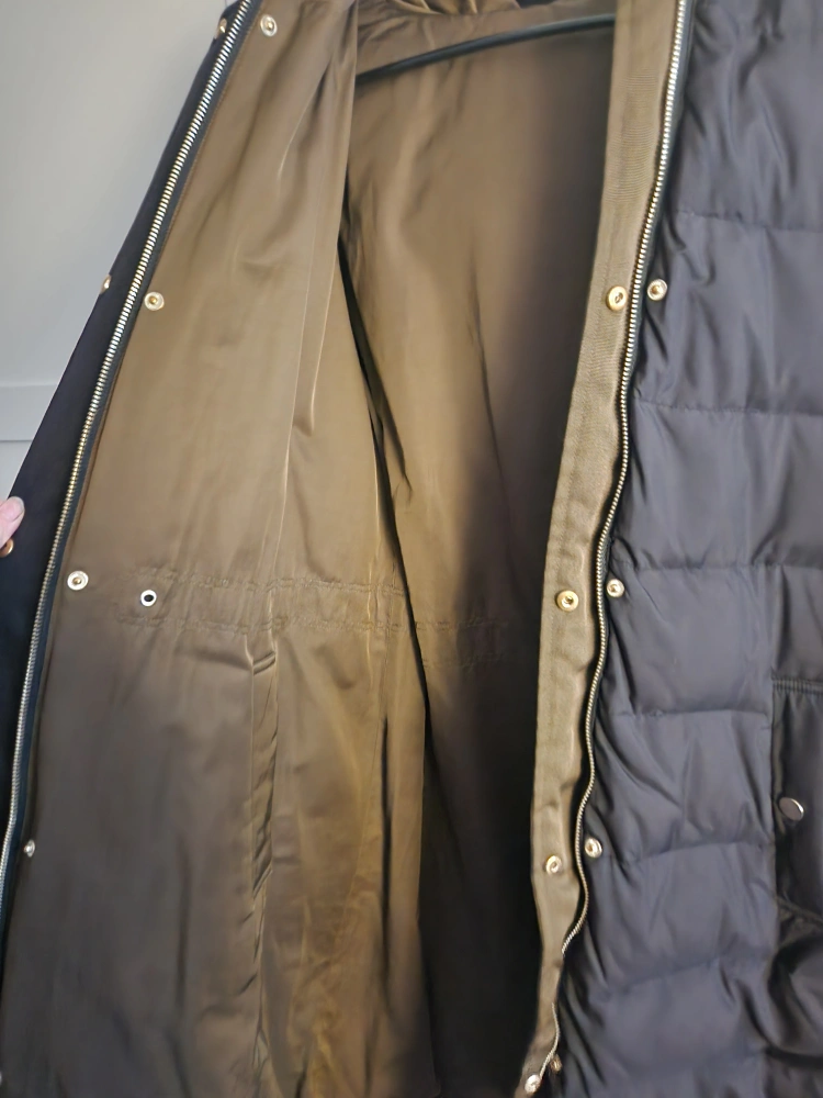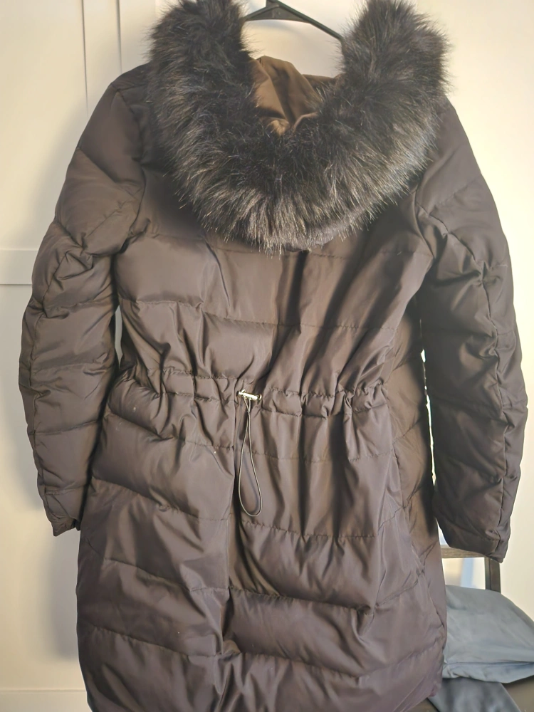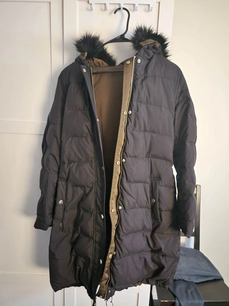 Long-length puffer jacket. Black outer shell, olive green lining. Features a faux fur-trimmed hood and drawstring waist. Zipper and snap closure. Warm and stylish winter coat.