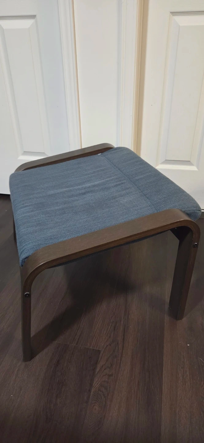 Comfortable ottoman with a blue fabric seat and a dark wood bentwood frame. It's a stylish addition for any living space. This ottoman is great for resting your feet.