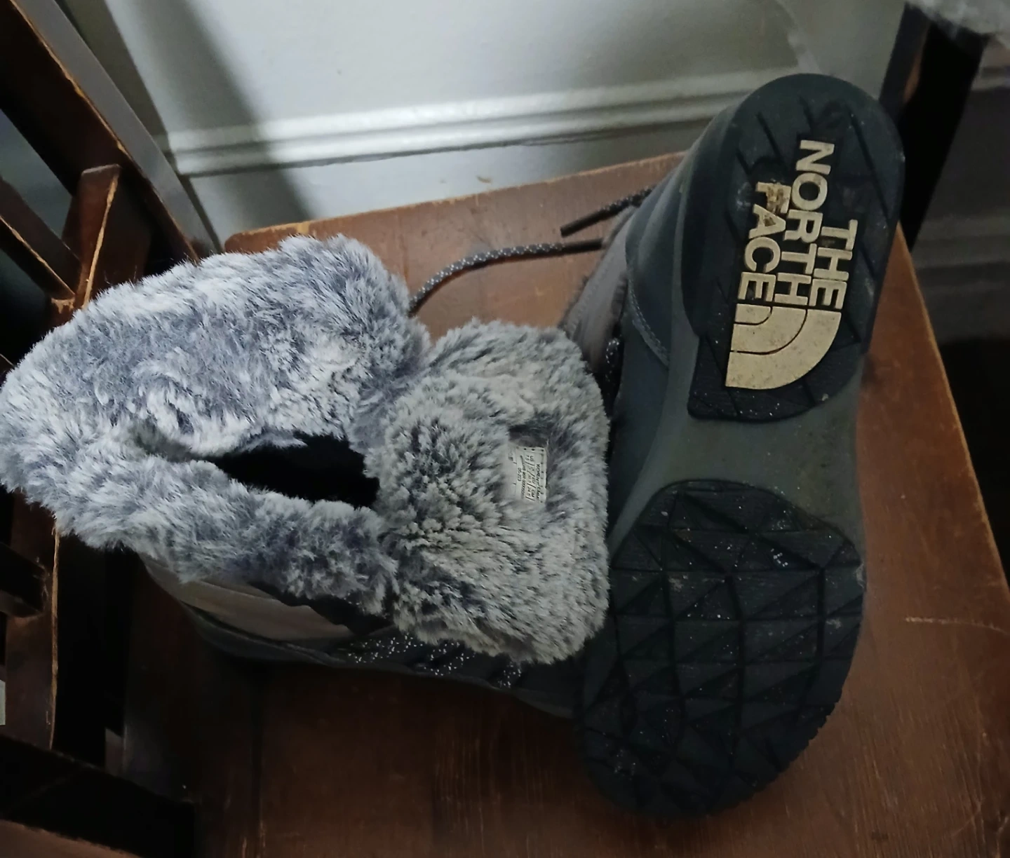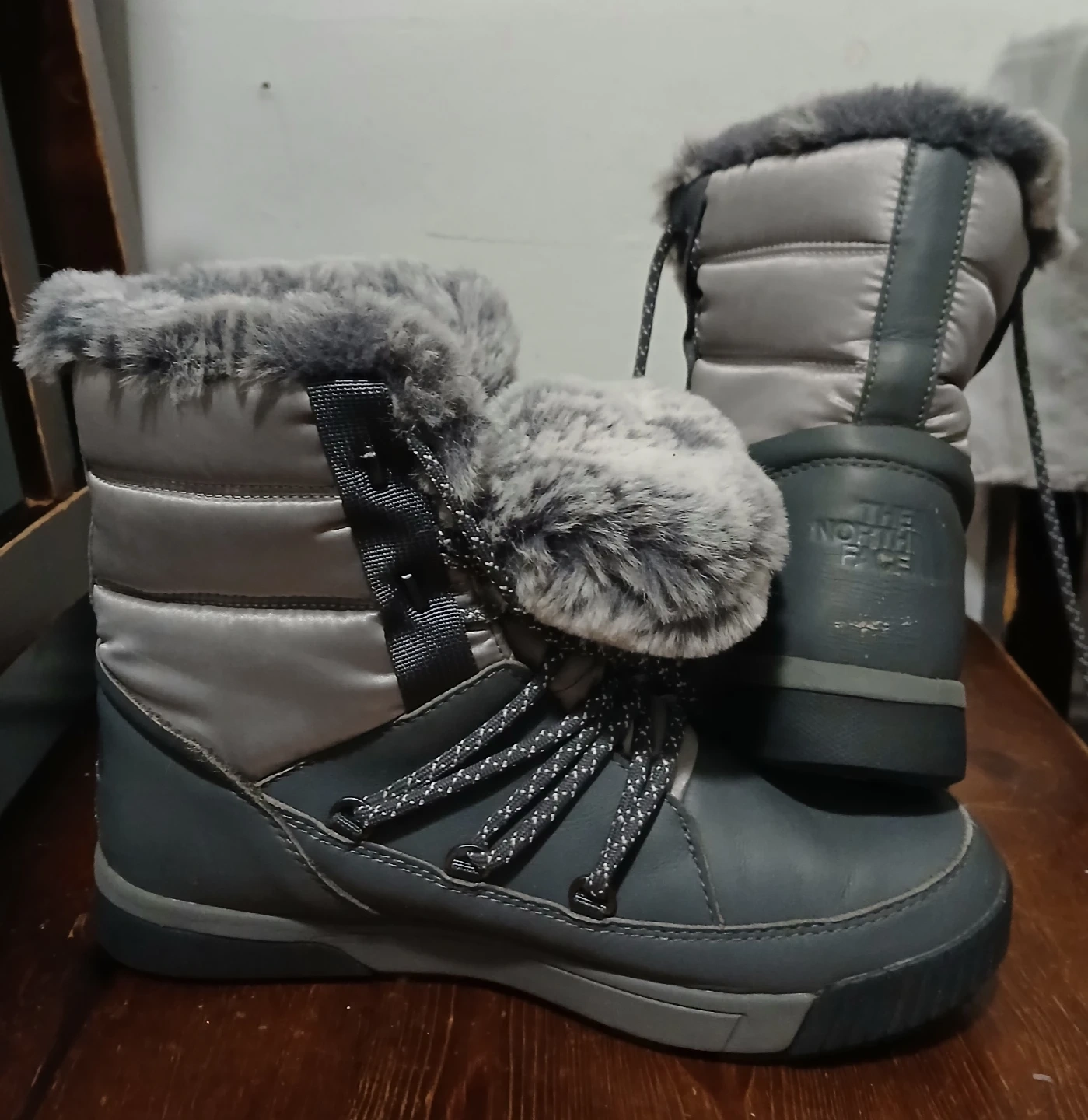 These gray winter boots from The North Face are designed for warmth and comfort. They feature a faux fur lining and lace-up closure. Durable sole provides good traction. Size 7.5 adult.