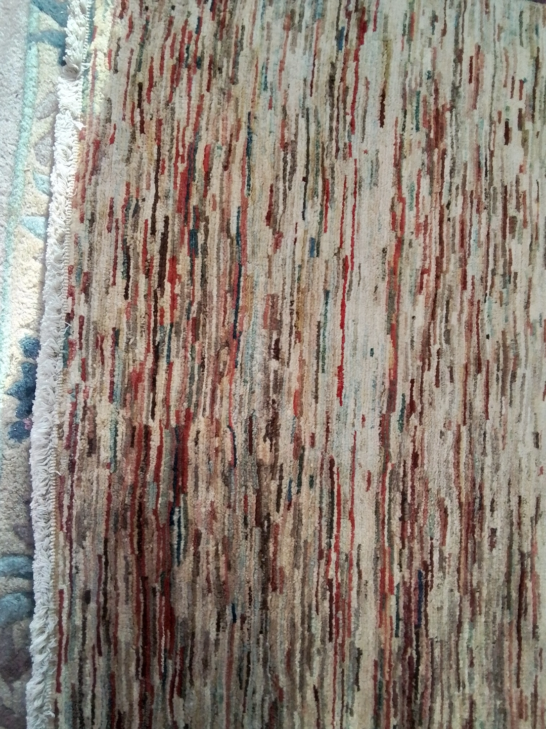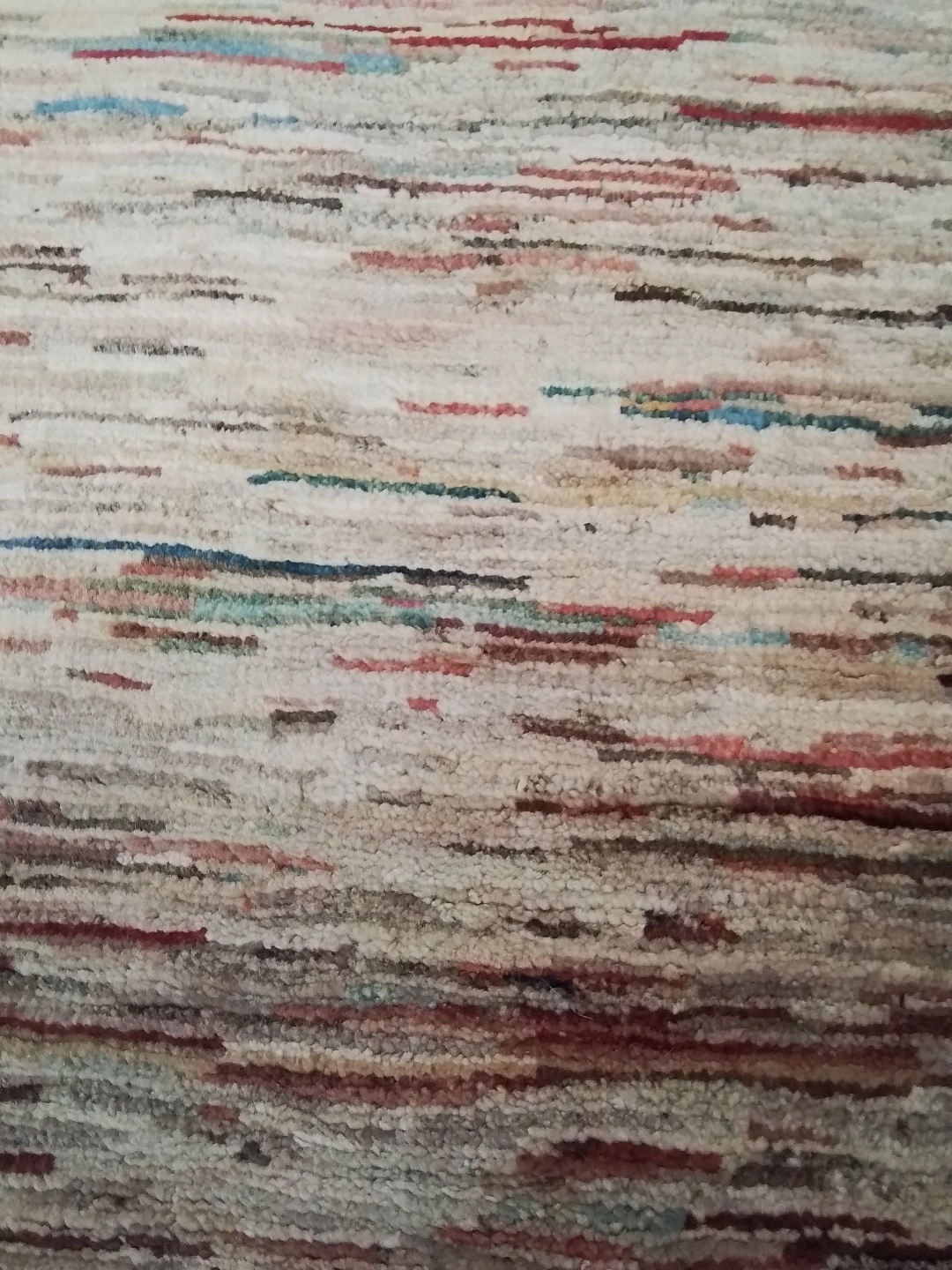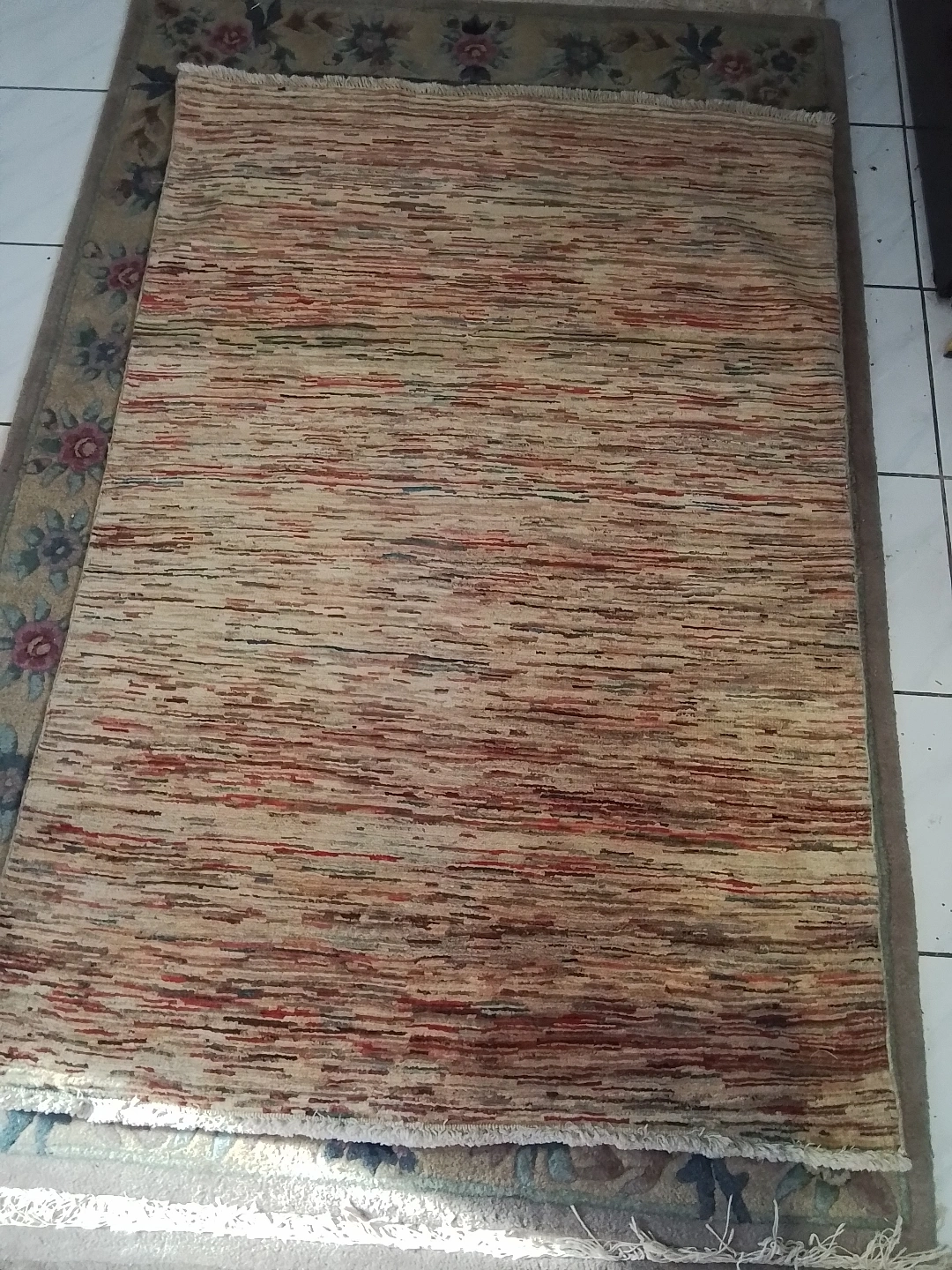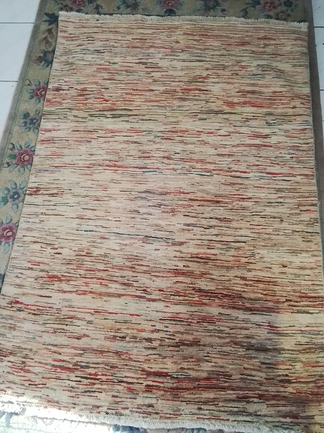 114Great Gabeh Afghan Wool Carpet Beautiful area rug. Features horizontal stripes in various shades of red, brown, beige, and cream. Soft texture. Fringed edges. Excellent for adding warmth and style to any room. Area Rug, Multicoloured Horizontal Stripes This is a really nice Afghan carpet made with all wool and vegetable dyes. A nice soft design and colours. Never used. Condition: Never used Measurements: 4.10 by 3.4 feet Pickup at Young Street and Steels Ave
