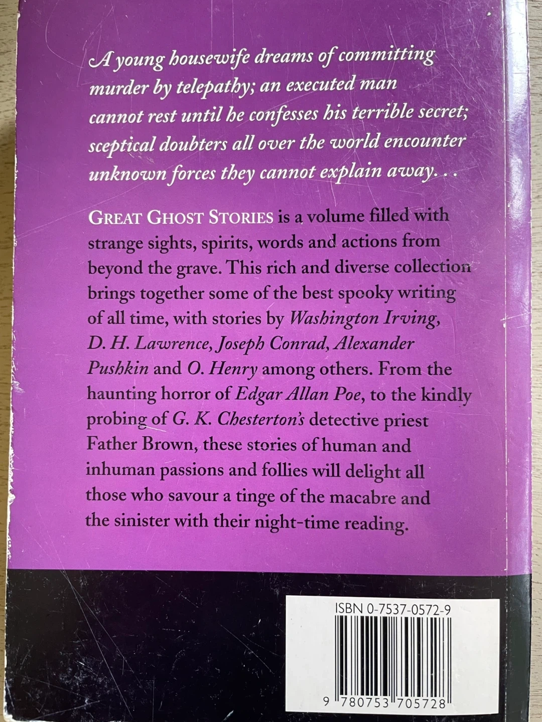 91Selling a copy of Great Ghost Stories. This volume includes spooky writings from Washington Irving, Edgar Allan Poe, Joseph Conrad, and many more. Perfect for those who enjoy a tinge of the macabre and the sinister in their reading! Paperback $5.00