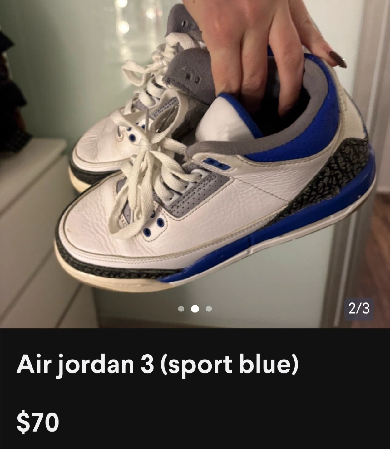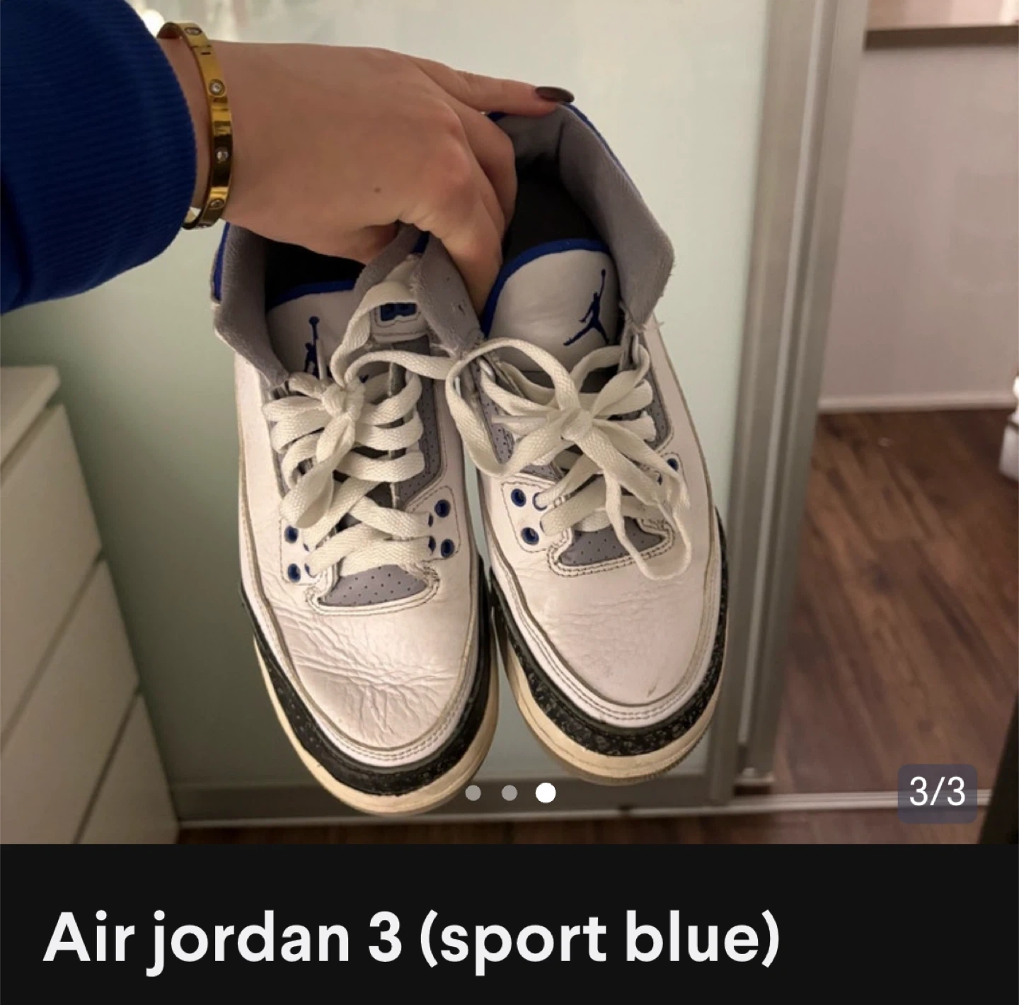 Buy & SellAir Jordan 3 (Sport Blue)Air Jordan 3 (Sport Blue)$45Selling a pair of Air Jordan 3 in the Sport Blue colourway! They show some signs of wear, as pictured.Size5YBrandNikeWHERE TO MEETHumber Bay ShoresView MapSELLEREveHumber Bay Shores413 reviews0 chats·0 favorites·15 viewsSEND CHAT TO SELLERHi Eve! I’m interested in your listing.Hi Eve! I’m interested in your listing.Get the Karrot app to chatSign In to chat