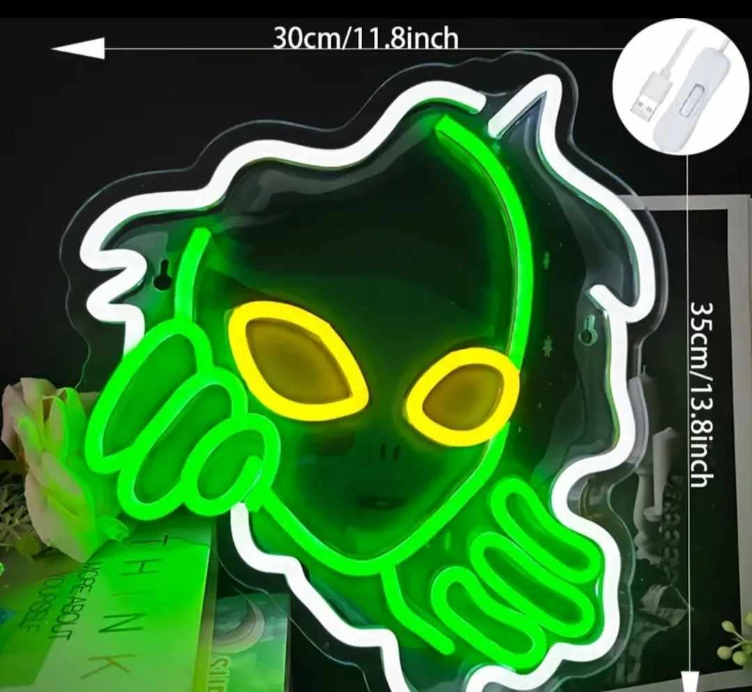 USB powered neon light. Features a green alien face. Measures approximately 30cm x 35cm.